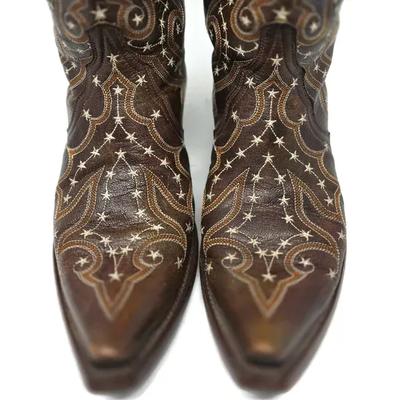Swirling embroidery with stars throughout Beautiful condition Snip toe Shaft 11" Heel 1.5" Length from heel to tip of toe 10" Made in Mexico