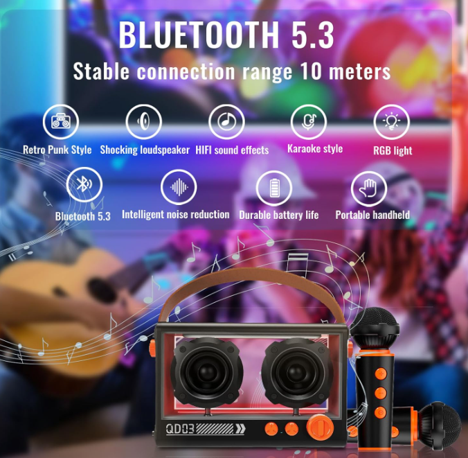 Zelle2 KARAOKE SPEAKER- The karaoke machine features two 10-watt speakers that deliver unmatched HI-FI sound quality and advanced technology, providing 360° surround sound for clearer audio, stronger bass, and minimal noise. With 7 light colors and 4 light modes to adds a vibrant ambiance to your experience