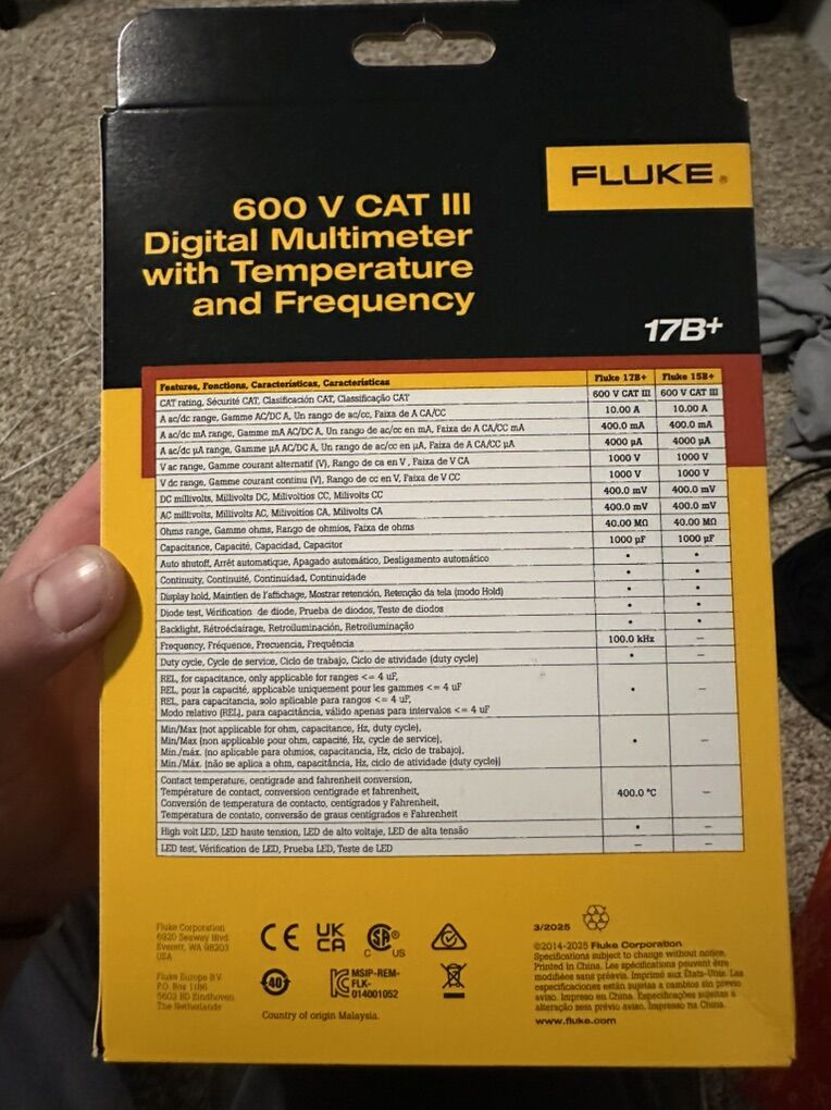 Features: True RMS accuracy Measures voltage, current, resistance, continuity, and capacitance Temperature measurement (°C/°F) Rugged, trusted Fluke build quality