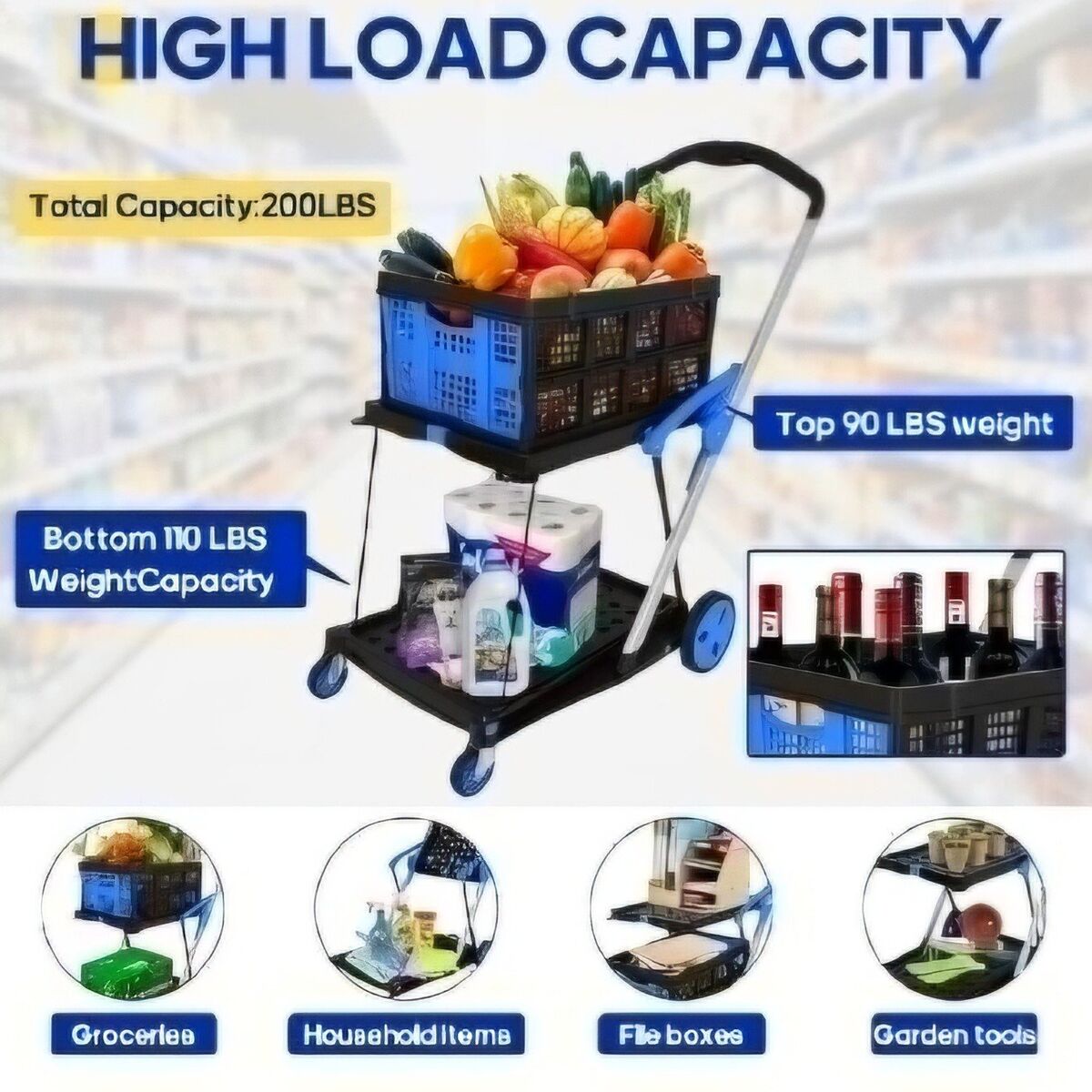 Multifunctional Folding Cart with Wheels,Two Layers Collapsible Utility Cart for Groceries, Office, Warehouse, Supermarket, Double Layer Foldable Shopping Cart (Blue), Collapsible Handcart Heavy Duty Folding cart.