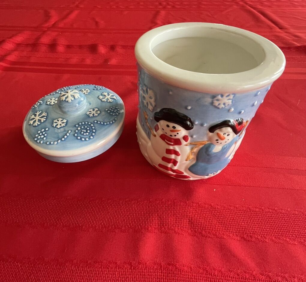 VenmoThis is a Houston Harvest Snowman/Snowflake ceramic holiday canister. The painted picture on the canister and lid is in 3D. The piece is in excellent condition with no chips or scrapes. The lid fits securely to the top of the canister. Can be used for hot cocoa mix, candy, cookies or treats for the Christmas holidays. It is 7” high and has a diameter of 5”.