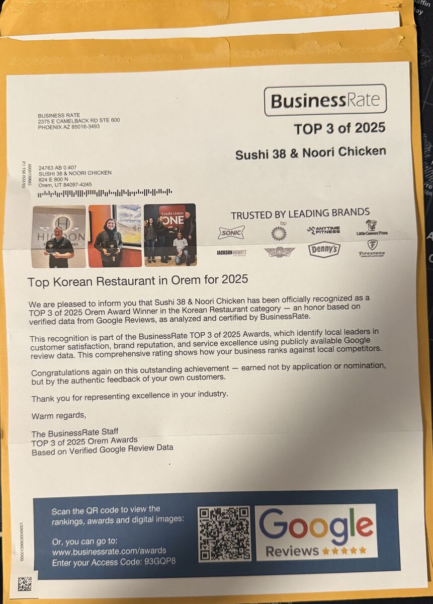 Sushi 38 & Noori Chicken is a vibrant culinary destination that masterfully combines the art of sushi with the rich flavors of Korean cuisine. Renowned for its visually appealing presentations, each dish is crafted with attention to detail, often served in charming decorative bamboo boats that elevate the dining experience. Customers frequently praise the freshness of the ingredients, noting that the sushi rolls are not only beautifully presented but also bursting with flavor. The menu features a delightful array of options, including unique rolls like the Red Dragon and Mango Tango, alongside classic favorites such as California rolls and bibimbap, all prepared to perfection. The restaurant's atmosphere is warm and inviting, characterized by friendly service that makes every guest feel welcome. It stands out as a family-run establishment, fostering a sense of community and support for local businesses. The attentive staff is known for providing excellent recommendations, ensuring that each visit is memorable. Moreover, the restaurant caters to diverse dietary needs, offering gluten-free options and accommodating various preferences. With a focus on quality, affordability, and a welcoming environment, Sushi 38 & Noori Chicken is not just a place to eat; it is a destination that promises a delightful culinary adventure for all.