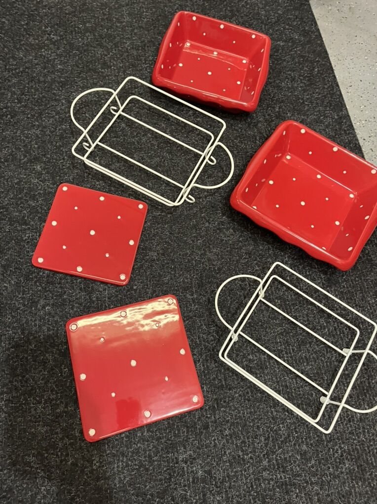 Set of polka dot serving dishes with holders