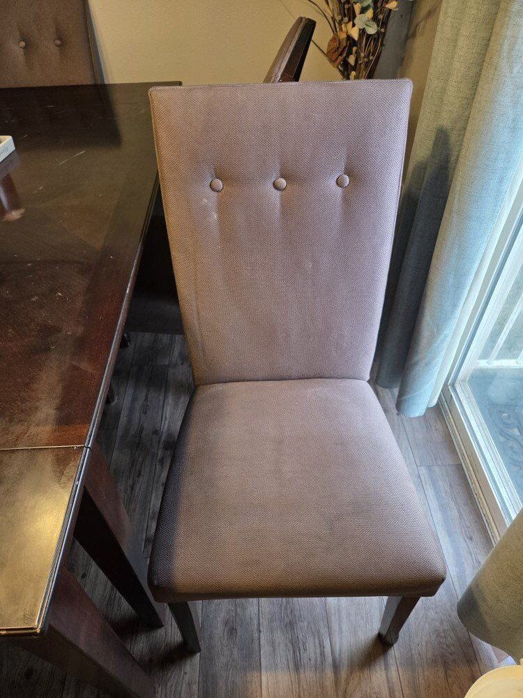 The closed table can fit 6 chairs, 5 are included. The chairs need new padding. We ended up adding our own cushion seats and chair covers.