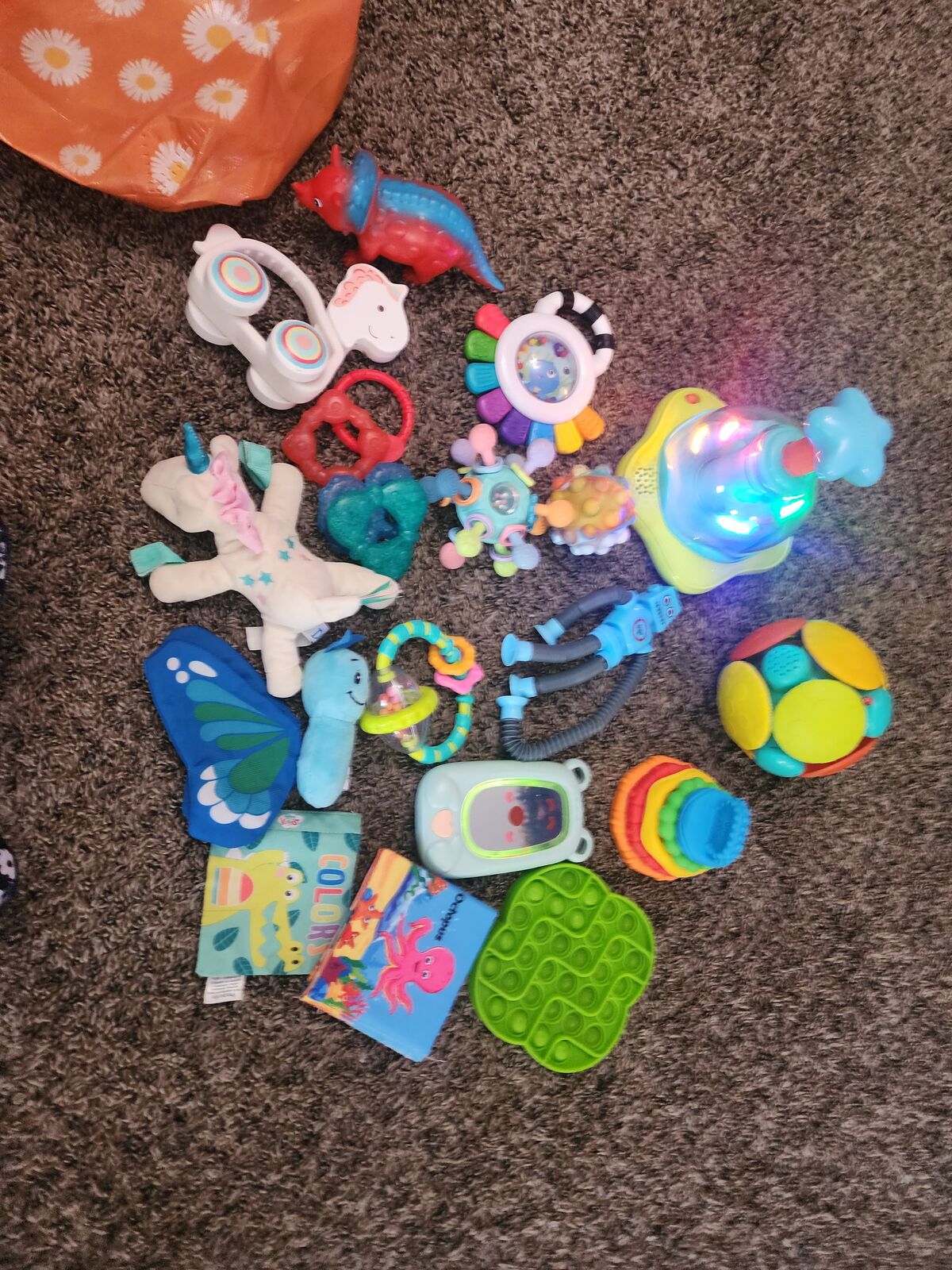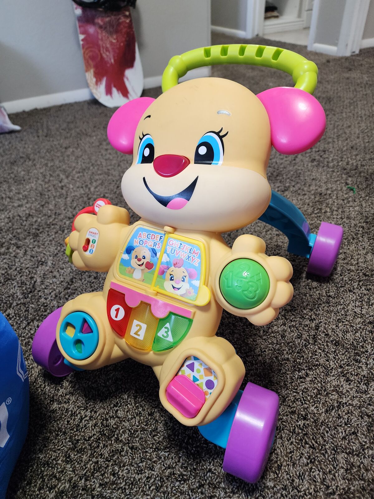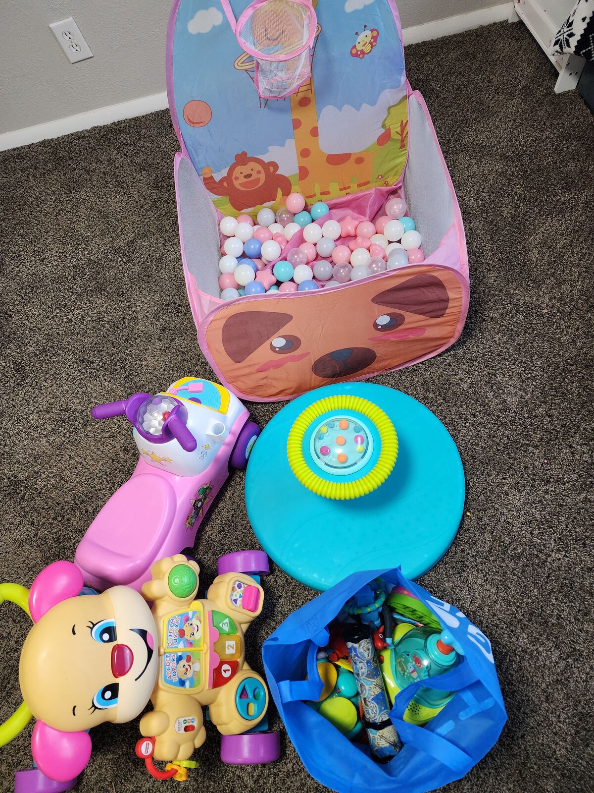 GooglePayBall pit with balls, sit and spin, pink sit on car, vtech walker including a bag of random toys. Non smoking clean home. Gently used