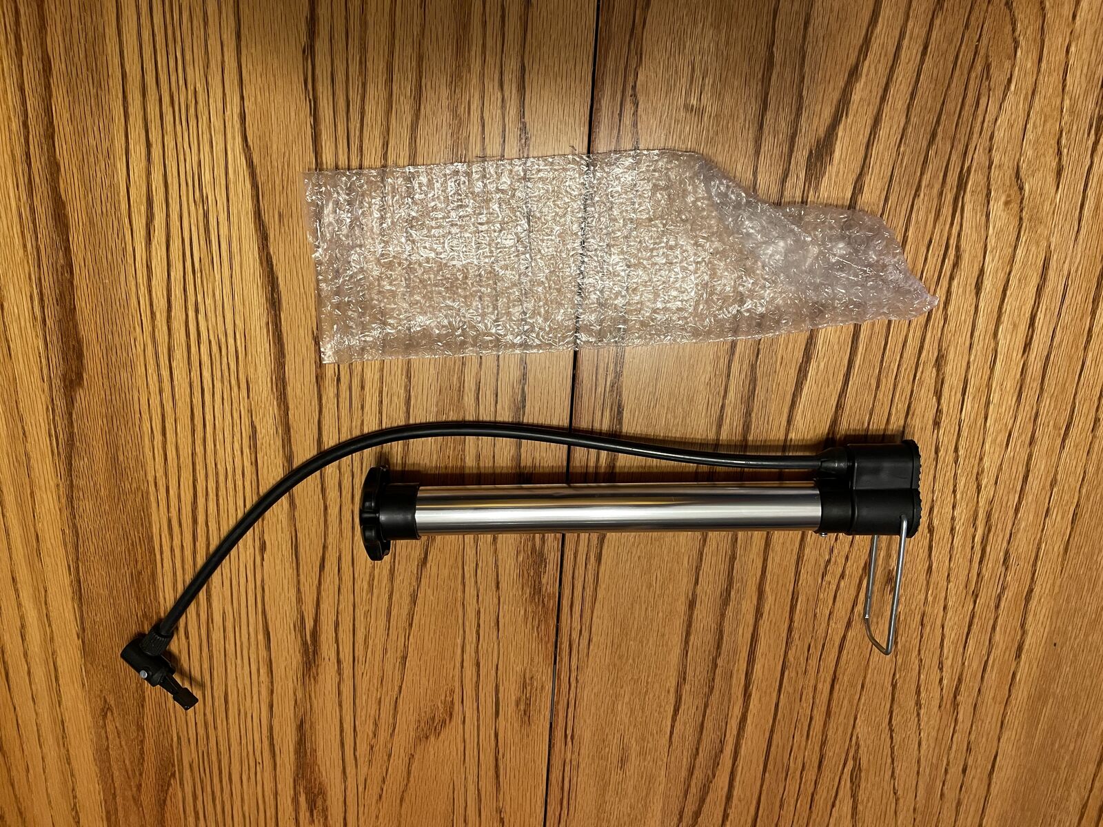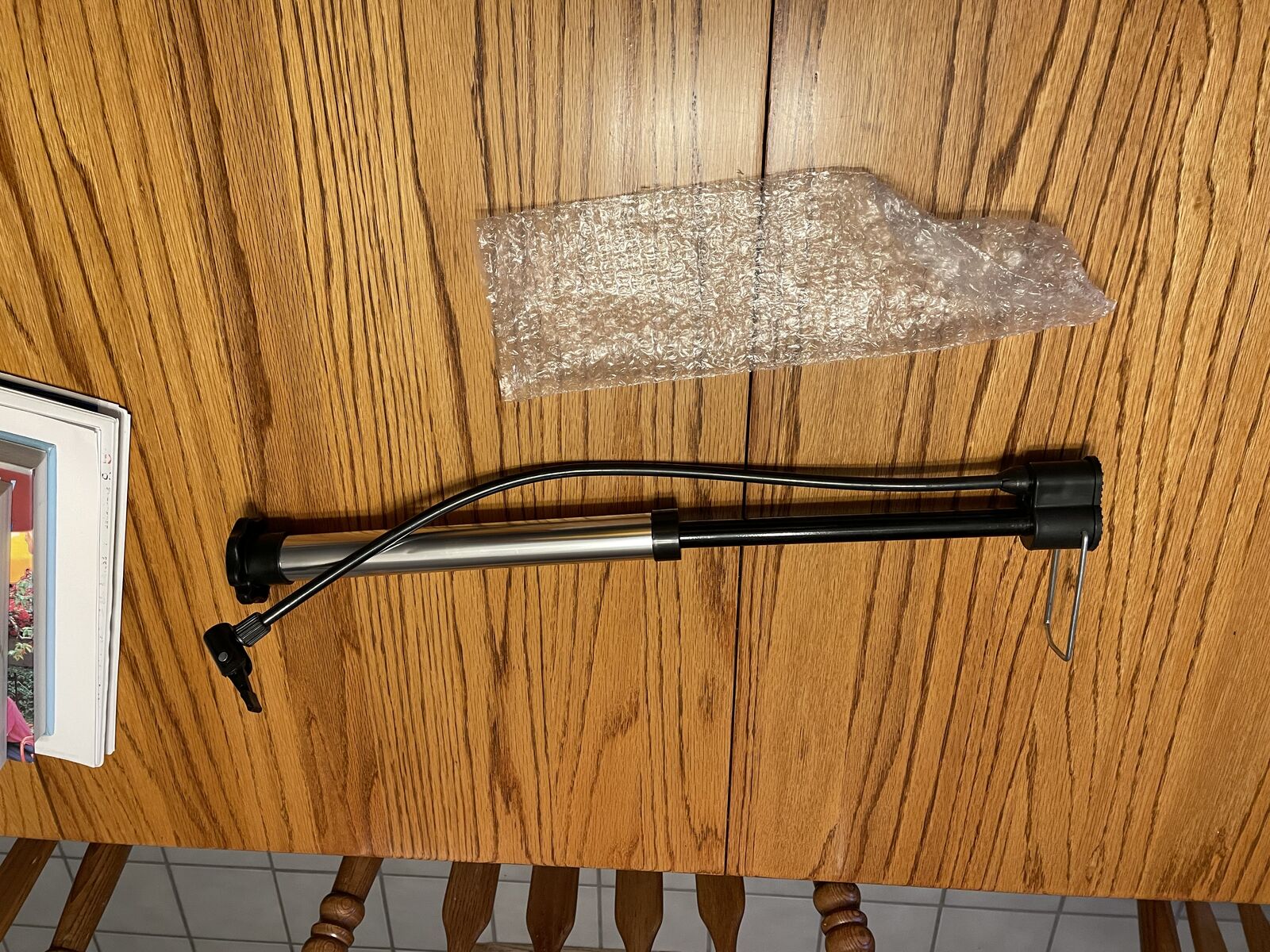 ZelleSmall portable bicycle tire pump. Fits standard tire valves. Pumps up bicycle tires quickly.