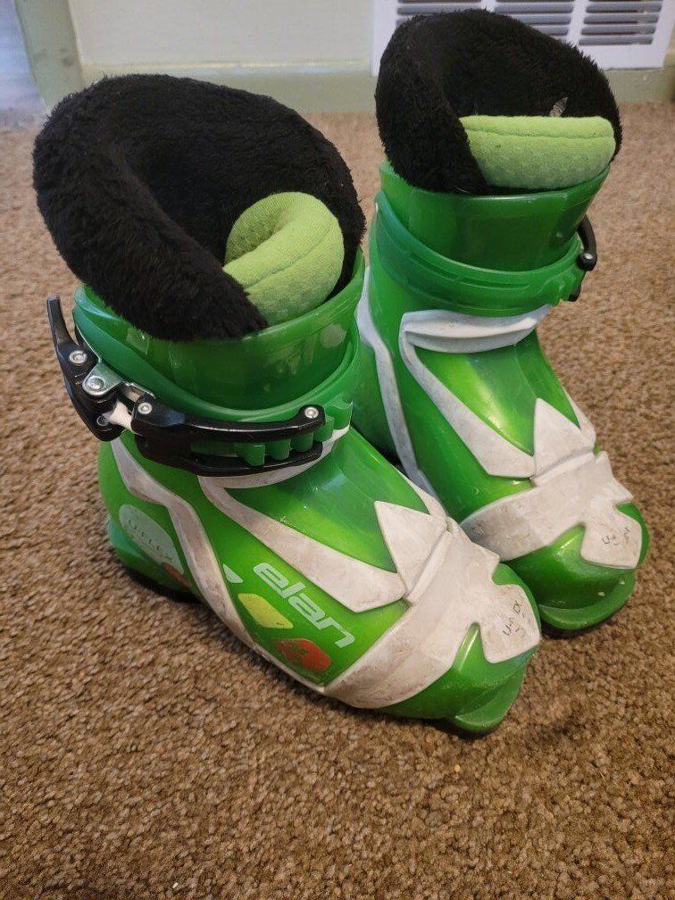 VenmoElan EZYY U-flex ski boots. These are great for a growing little one, simple and extremely easy on and off. says 233mm and size 17-19.5