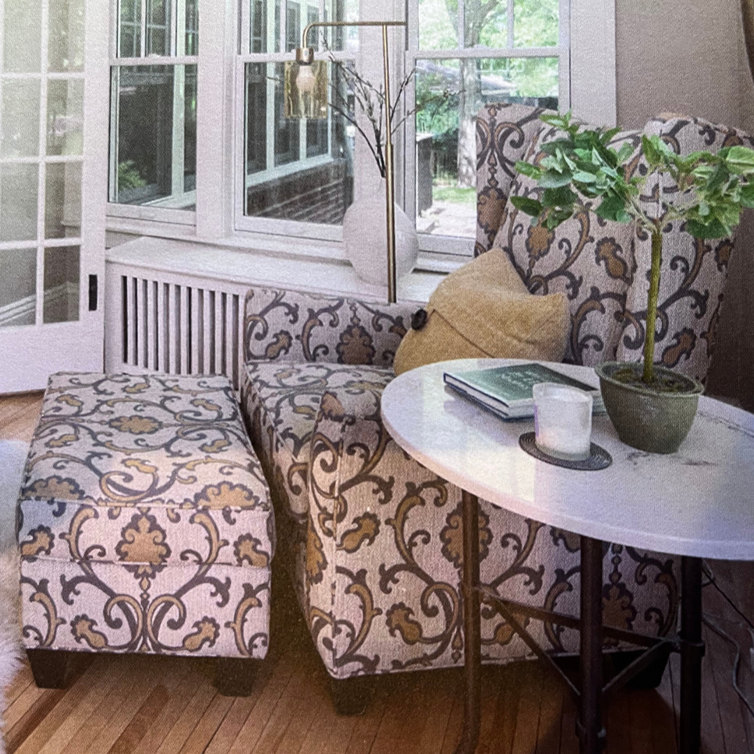 Stylish high‑back chair and ottoman set with a white fabric upholstery featuring an elegant gold & gray damask pattern. Perfect for adding vintage charm to a living room, office, or reading nook. The chair has sturdy construction, comfortable cushioning, and a timeless winged design. In great condition and is ideal for décor‑focused buyers looking for a statement piece.