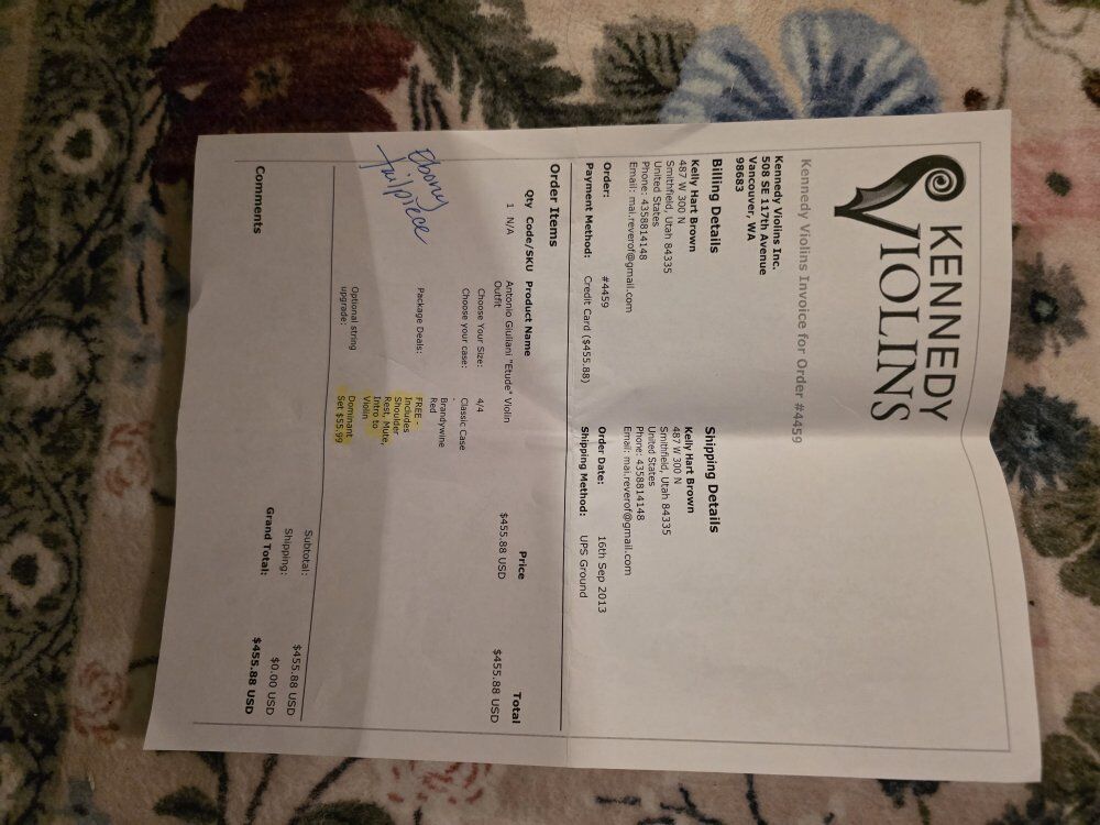 VenmoAntonio Guiliani Etude student violin in mint condition. Only used for a few lessons. Includes rosewood bow, lesson books and hard case. These are currently selling through Kennedy Violins for $460.00.