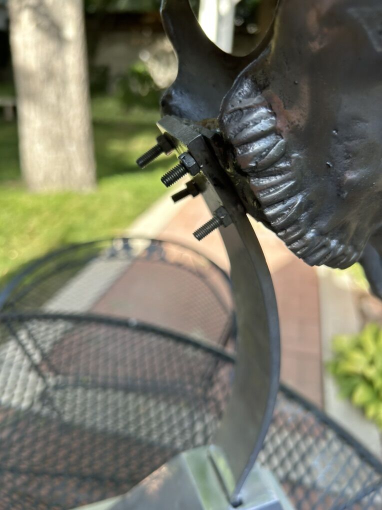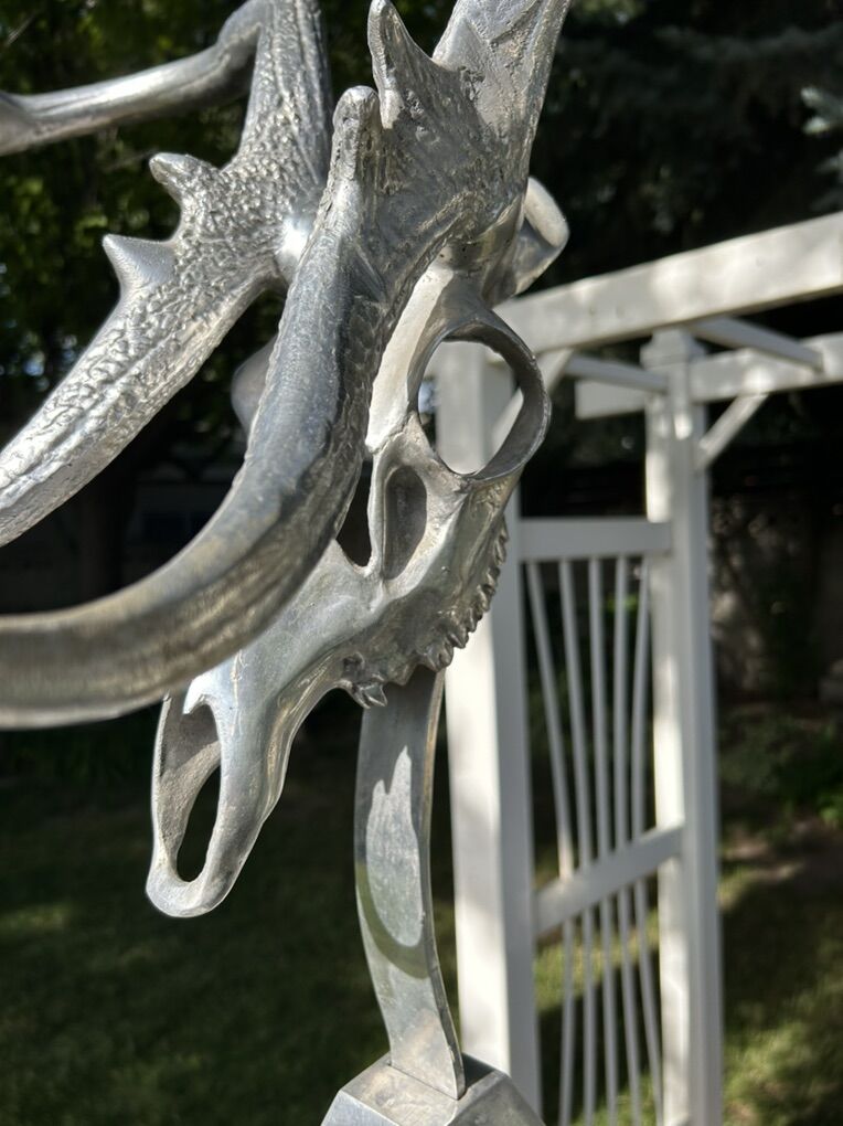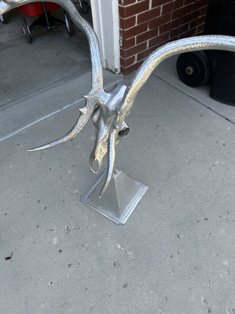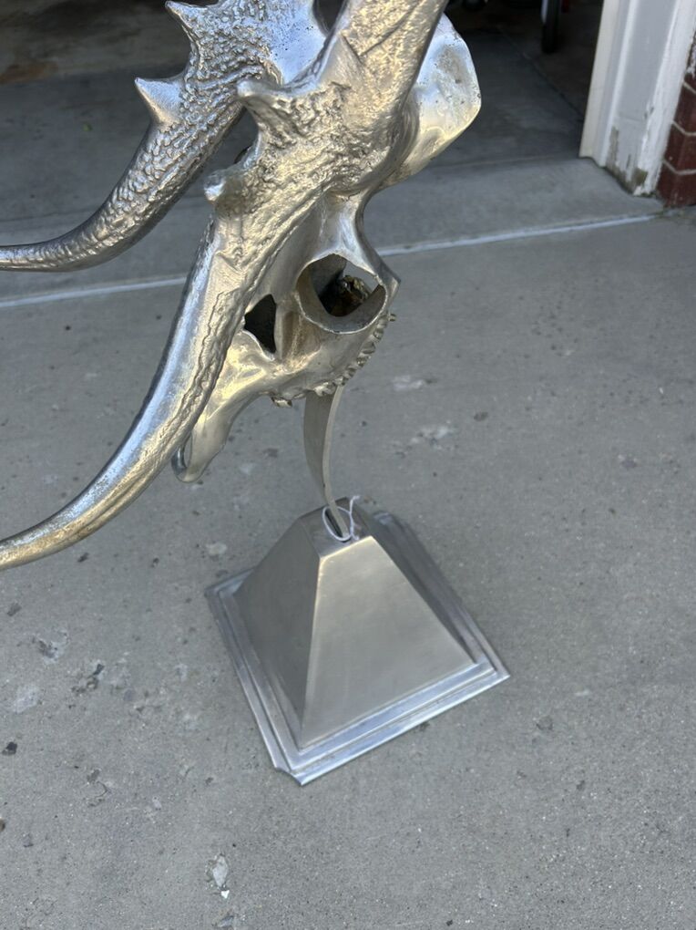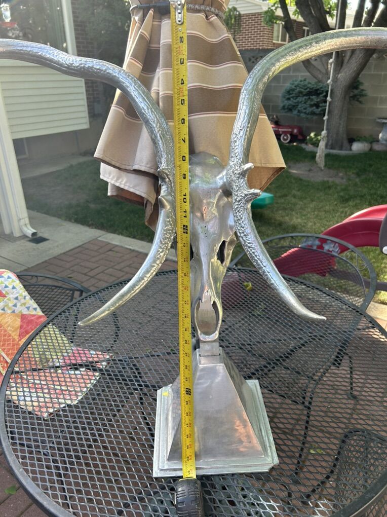 Art deco style skull and antlers. Cast aluminum. Was told it was a JC Penny display at one time. Stands about 3’ Has corners broken and has spot of yellow paint on base.