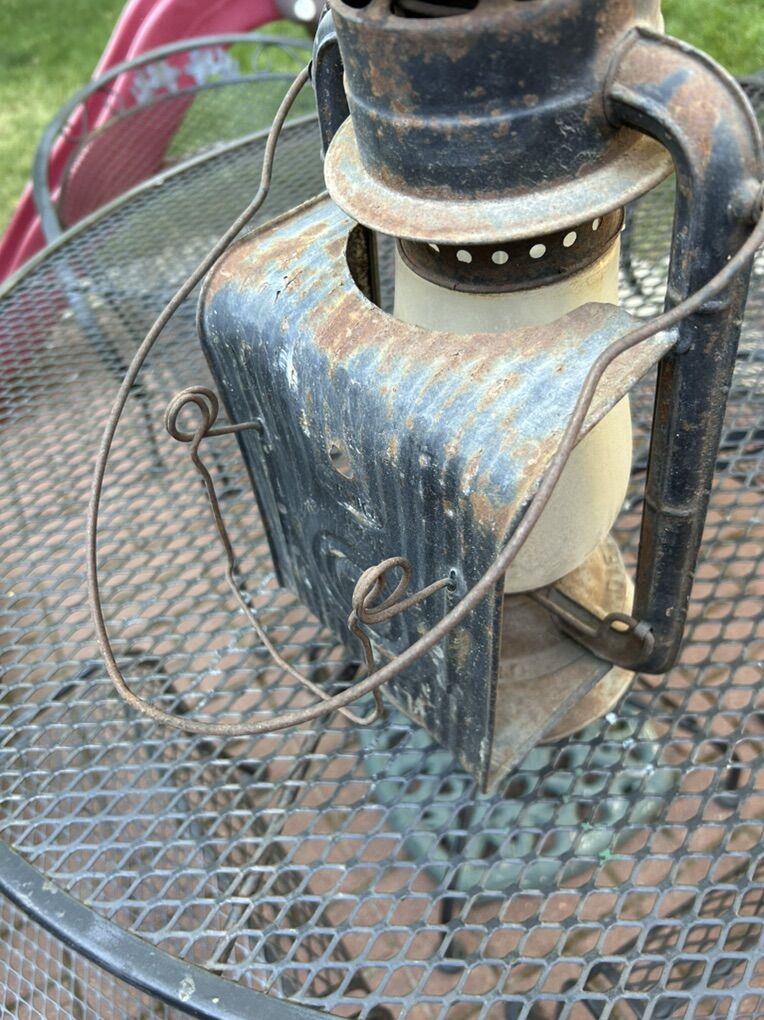 Carriage lamp? Rusty with a good look. Glass looks as if no cracks.