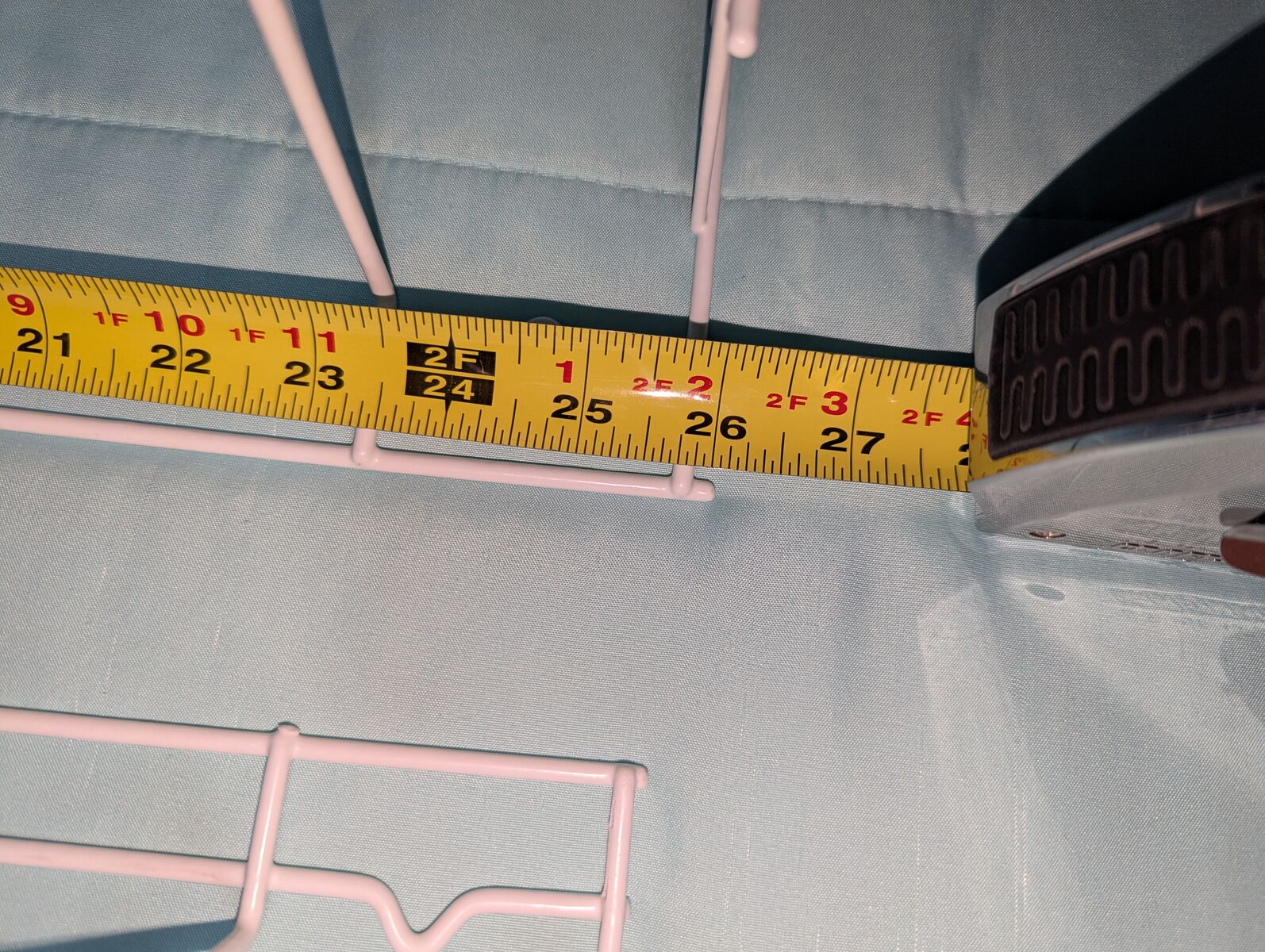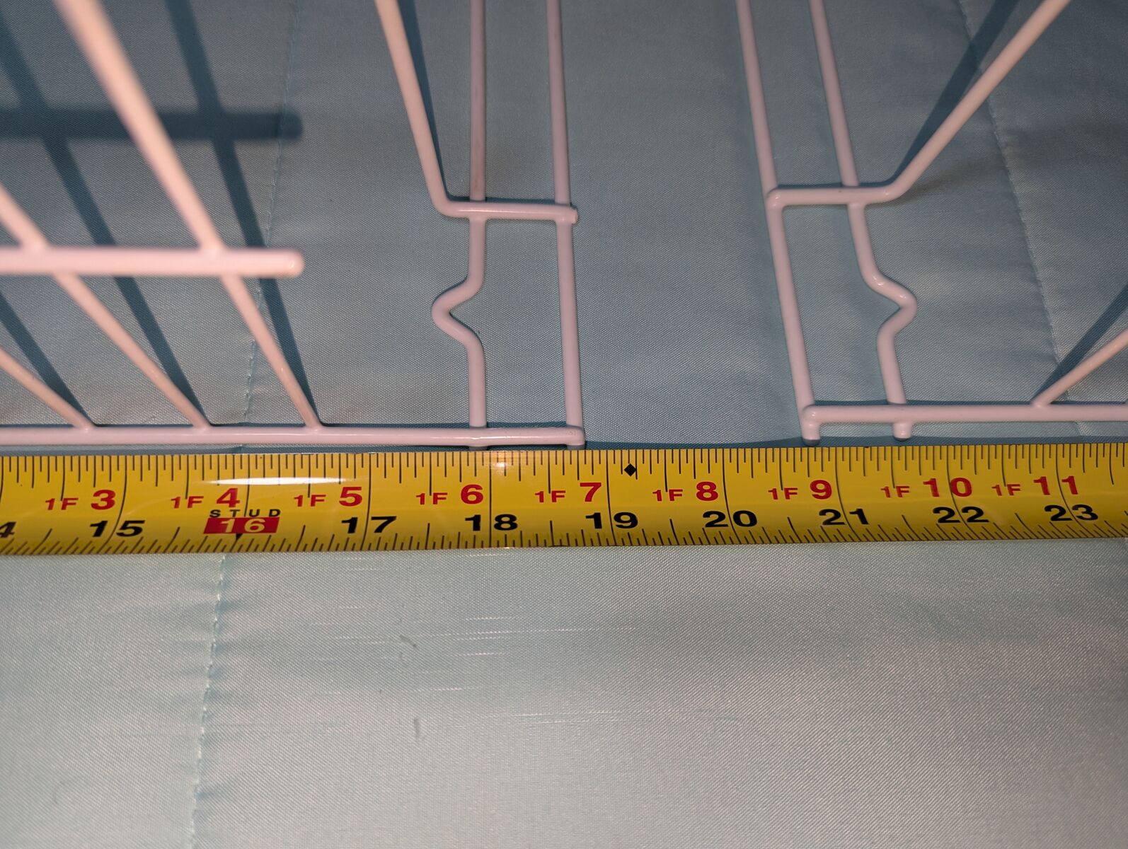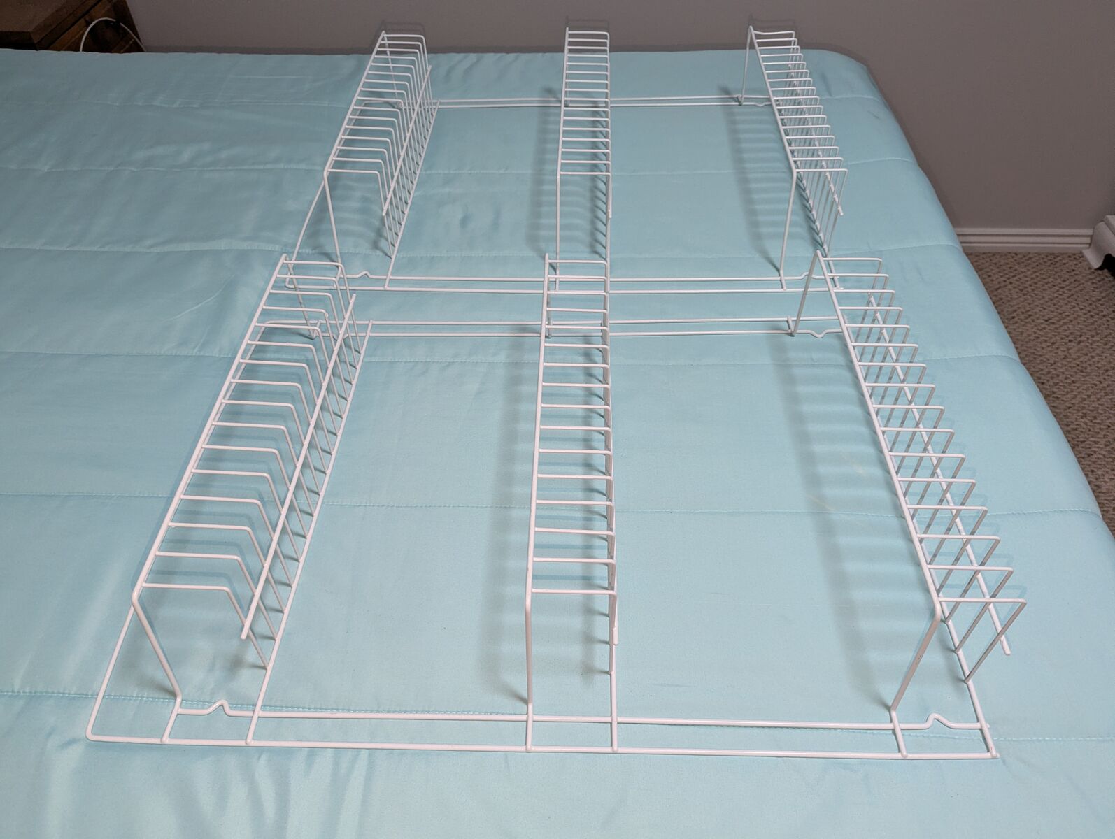 Wire Shelves Door Mounted Set Of Two. Measure 19" wide x 26" height. Can be hung with included hooks together top to bottom. Or can use screws for mounting. As New.