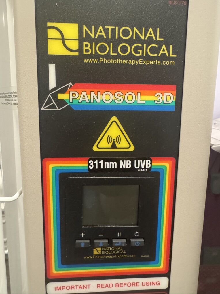 The National Biological Panosol 3D is a full-body, at-home ultraviolet (UV) light therapy system used to treat skin conditions like psoriasis, vitiligo, and eczema, offering convenient and private treatment with UVA or Narrowband UVB options.