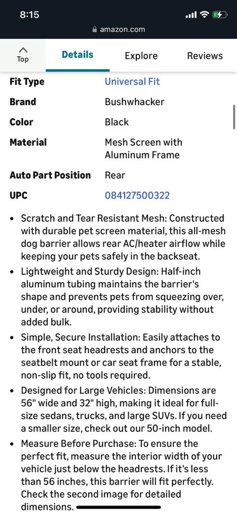 https://www.amazon.com/Bushwhacker-Barrier-Restraint-Backseat-Divider/dp/B0076BE458/ref=mp_s_a_1_3?adgrpid=187110706540&dib=eyJ2IjoiMSJ9.6aeZ14Pztu6Ome6MVsycOVQPBPHPpjwLTg7oGjIYOwF8h0-JcGcyiaw__IsU6M7HTj1nAjRzPAFOc_dRN3NoSKkp_1q7orSRJyUs3G6aRxBbzAInhG55zQQI_wki_9b3fsMC8TcGOGnpRIm_Kde3thyIqVWylVw8JdSJ4_JUXnlXXjShEVrUEnA98peqFdsZFHNeR9kiR9MvKnBCB2XVyA.9AUJ9mDaaArbj7eCup6jMv2R414soClJ0MMObCDkhdI&dib_tag=se&hvadid=779760996710&hvdev=m&hvexpln=0&hvlocphy=9029711&hvnetw=g&hvocijid=6998537823365691073--&hvqmt=e&hvrand=6998537823365691073&hvtargid=kwd-384102870427&hydadcr=14316_13387142_2372413&keywords=bushwhacker+dog+barrier&mcid=607eb0ed758f3849a0e0f8c12745c2d8&qid=1768360665&sr=8-3