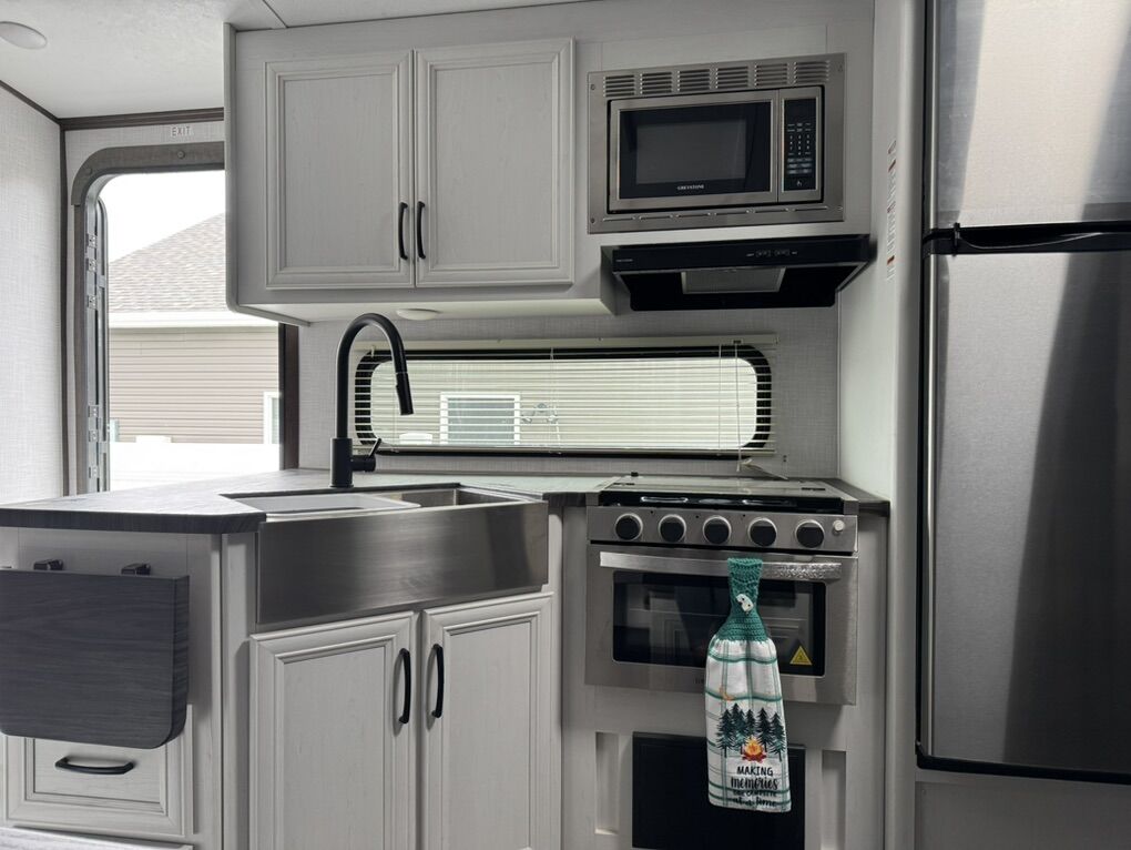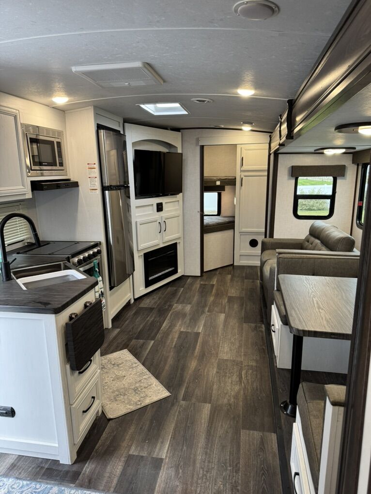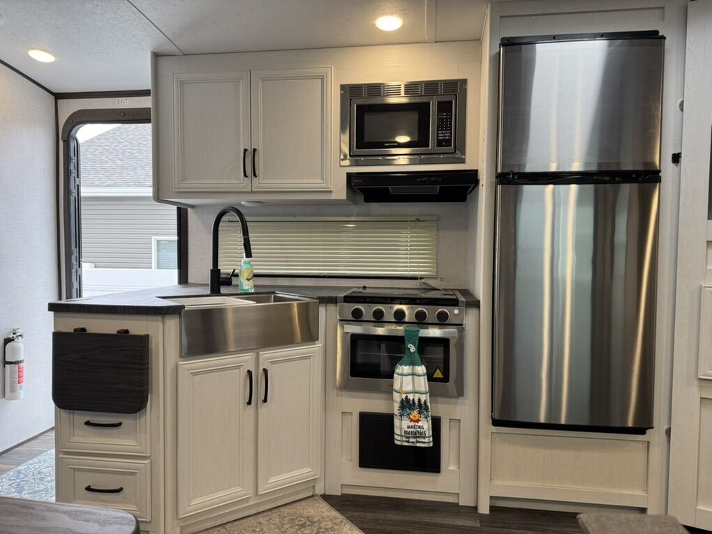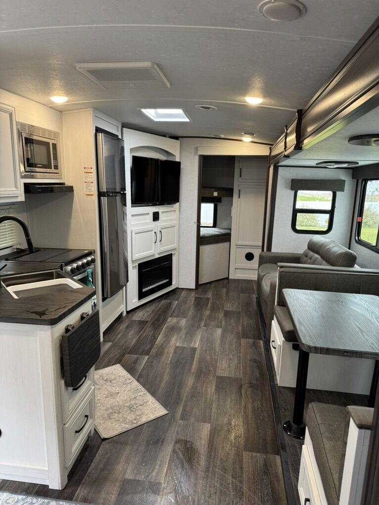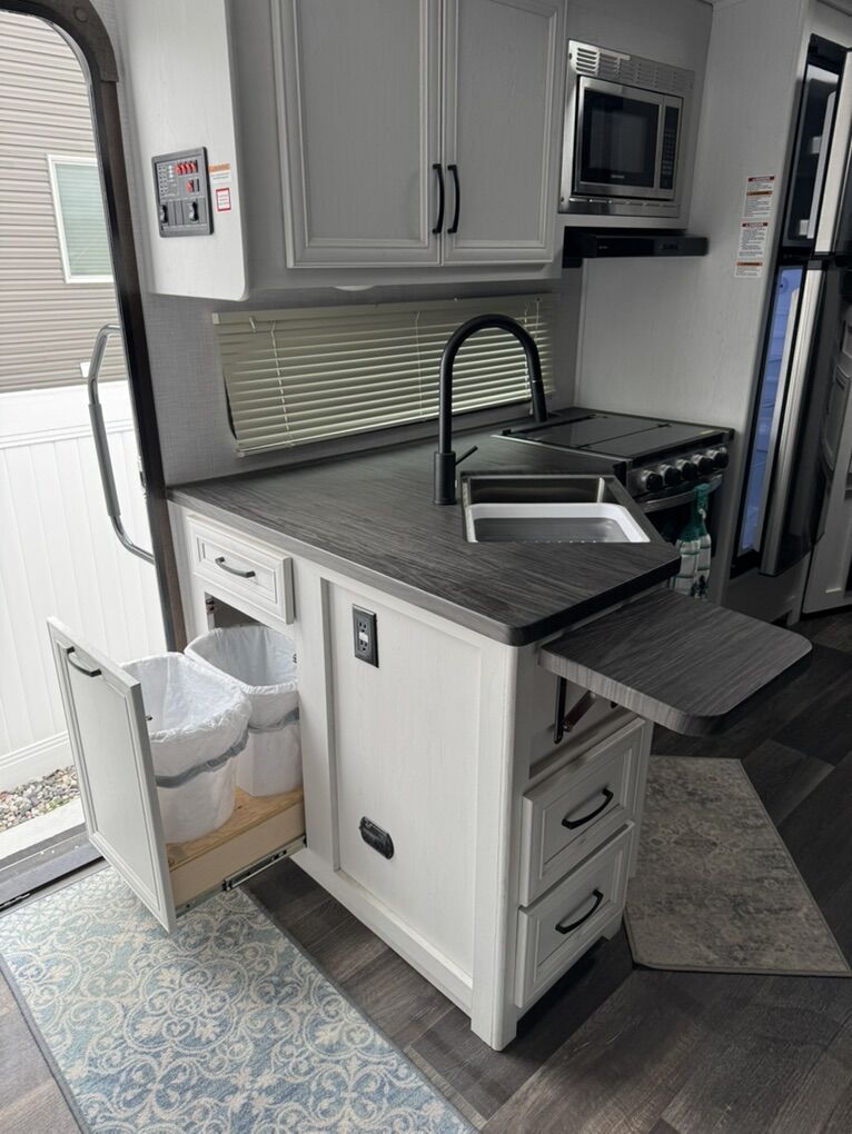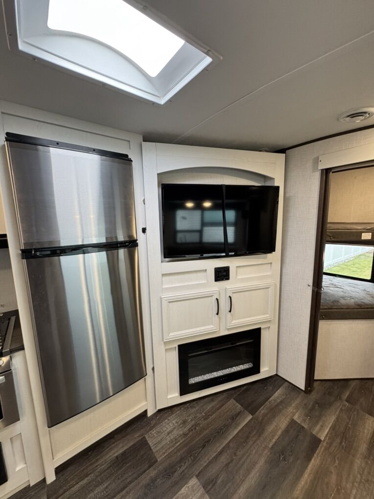 Hidden pantry with extra storage. Washer/dryer hookups. Fireplace. Entertainment system with tv. Outdoor speakers and awning lighting. Outdoor fridge and detachable outdoor grill.