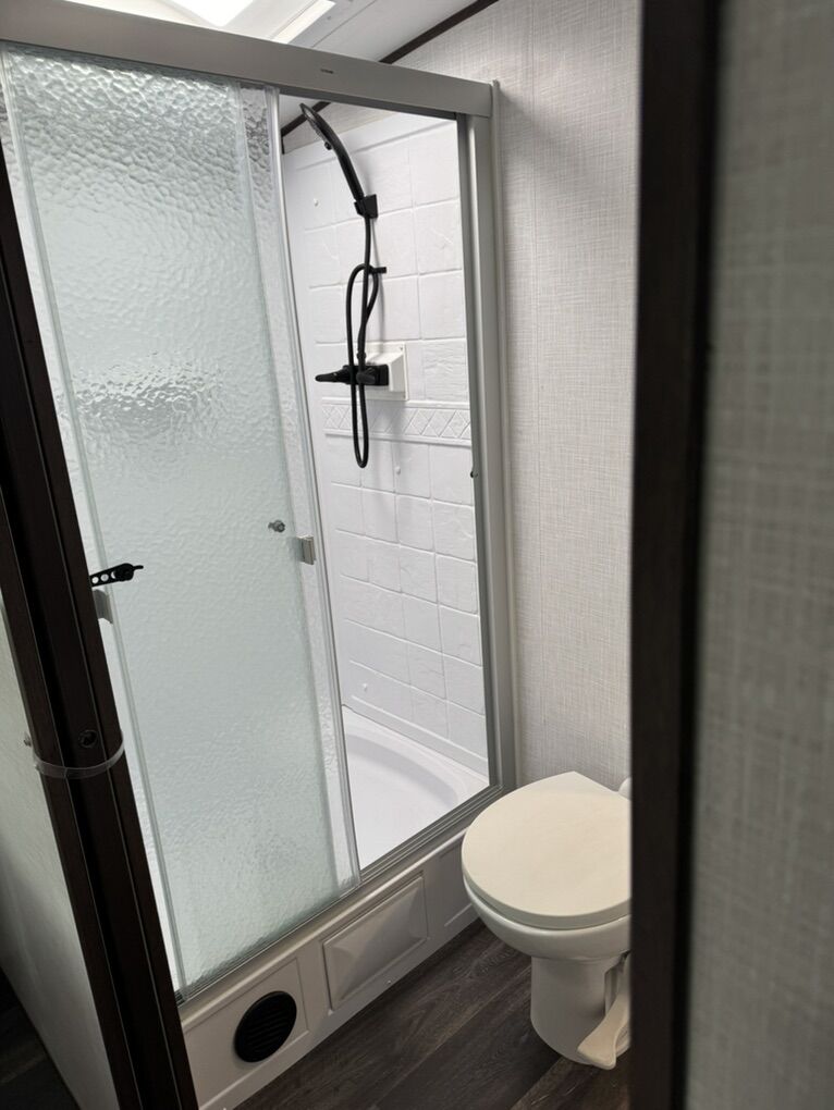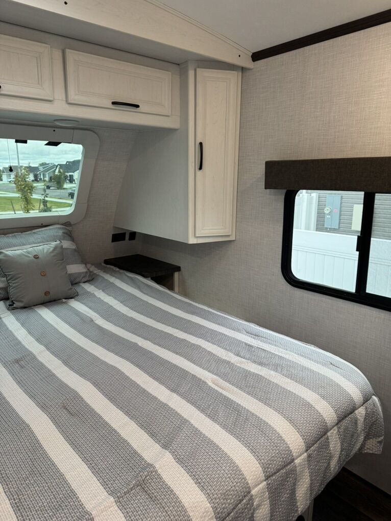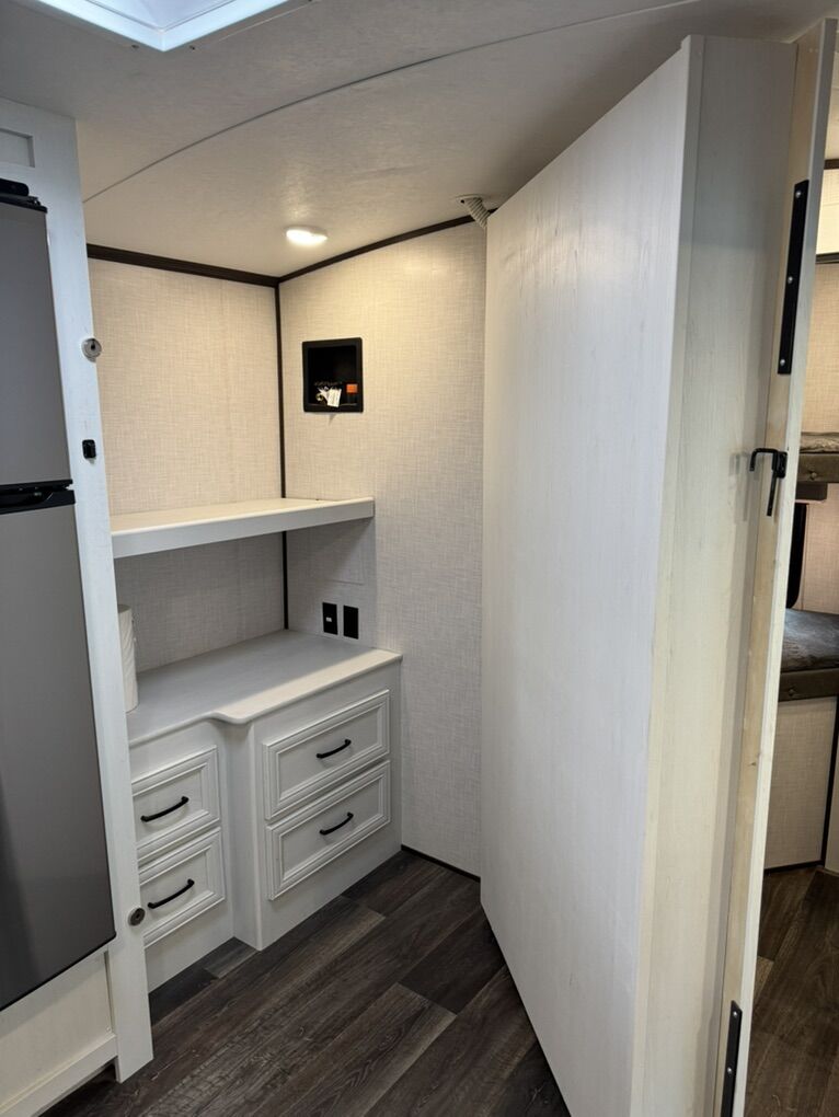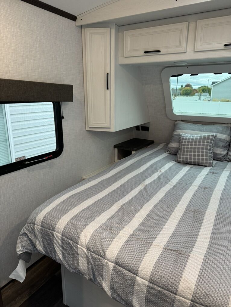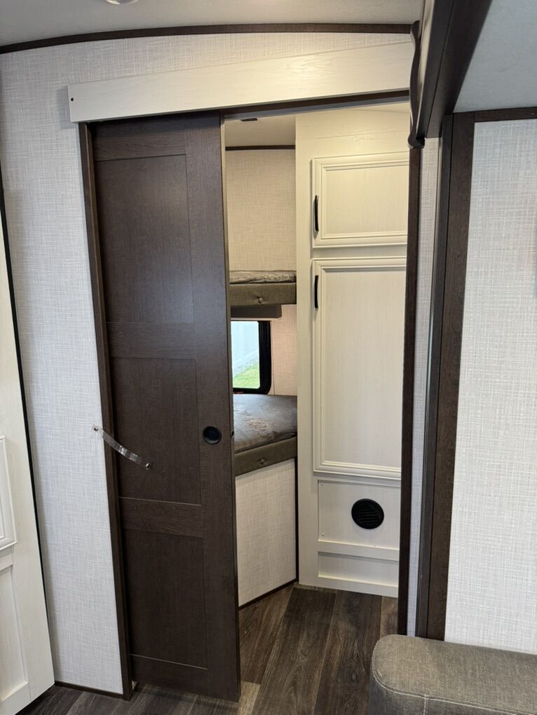 Storage under King bed in master suite. Solid doors separate bedroom, bathroom, and bunk area. AC unit with connection for second in master bedroom. Microwave. Equipped for solar power. Wifi capable.