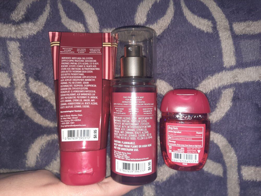 Venmowinter candy apple scent body cream, fragrance mist and hand gel. all brand new. willing to trade for bbw x milk bar peppermint bark truffle full size spary or cereal milk soft serve full size spray