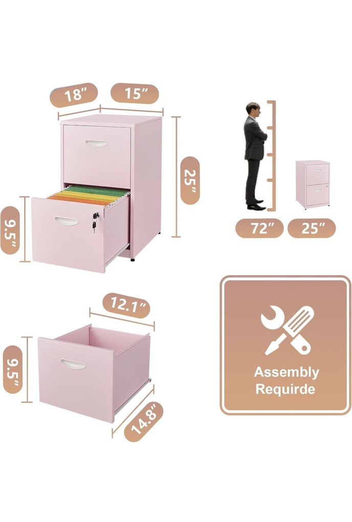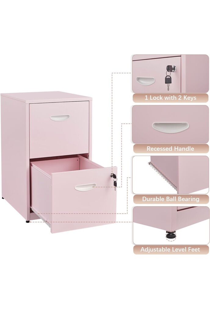 Brand Polup Color Pink Material 2 Drawer-Light Duty-Letter Size Recommended Uses For Product Files & Folders Product Dimensions 18D x 15W x 25H Special Feature Adjustable Feet, Light Duty, Lockable, Portable, Unbreakable SPACE SAVER: The 2 drawer file cabinet, measuring at 18D x 15W x 26H, is a perfect choice for compact spaces. Despite its small footprint, the two drawers provide generous storage. It neatly fits into tight corners and narrow areas, optimizing space without sacrificing functionality. It's a perfect solution for those seeking efficient storage without taking up much room. STURDY AND DEPENDABLE: The 2 drawer filing cabinet is assembled from thickened and reinforced metal panels which is built to last. The stable construction ensures that the drawers glide smoothly and can withstand the weight of your items without any sagging or damage. Please trust that it will maintain its integrity over time, offering long-term storage solutions for your needs. CHARMING PINK APPEARANCE: The pink two drawer file cabinet adds a touch of charm and romance to any space. It's not just a file cabinet for home office, but also a decorative piece that can brighten up various home areas such as bedrooms and living rooms. Whether use stands alone or blends with other furniture, it creates a pleasing visual effect. VERSATILE STORAGE OPTIONS: This file cabinet with lock is highly versatile in its storage capabilities. The two drawers allow different types of items to be stored separately, which helps to realize the sorting and sorting of items. It's perfect for keeping your workspace tidy, organizing your files and letters, or storing tools and accessories. Its flexibility makes it adaptable to different storage needs and lifestyles. EASY ASSEMBLY AND MAINTENANCE: Clear instructions and all the necessary hardware make assembling this locking filing cabinet is a breeze. Its user-friendly design means you can enjoy its functionality and beauty without the hassle of complicated maintenance. Invest in this convenient storage solution and enjoy a clutter-free life