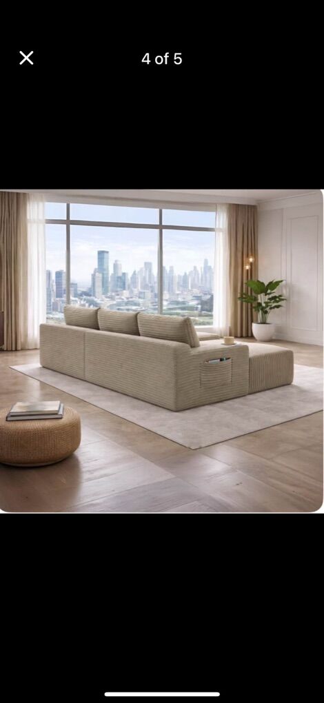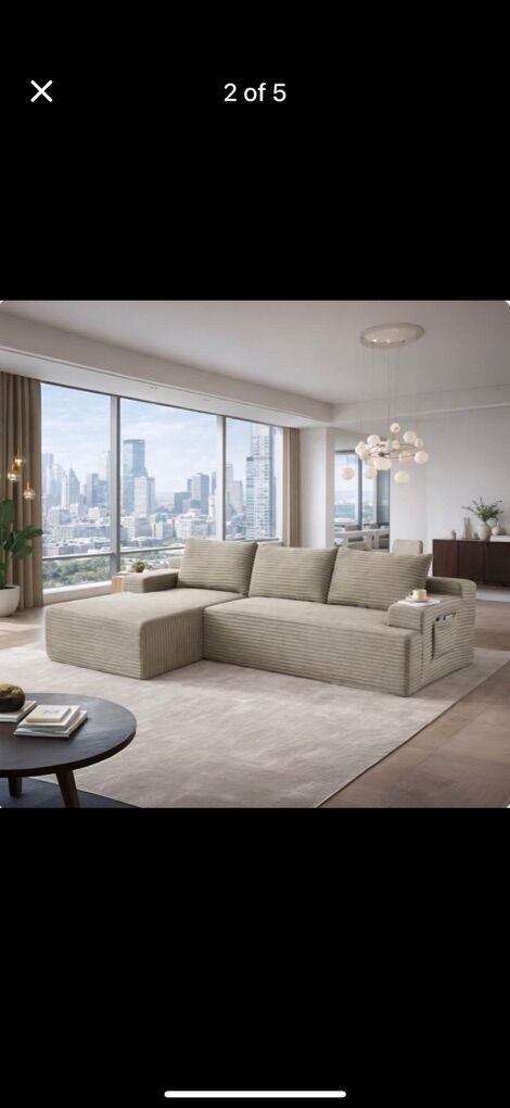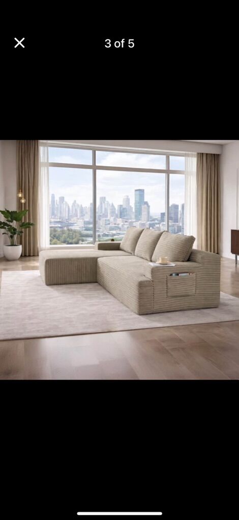 Sand Taupe Colored Sectional Cloud Sofa w/ left side L Chaise. Comfortable beige sectional sofa with chaise lounge. Has storage pockets on the armrests. Three large back cushions. Soft Corduroy Textured velvety fabric. Great for living room or family room. Super comfortable.