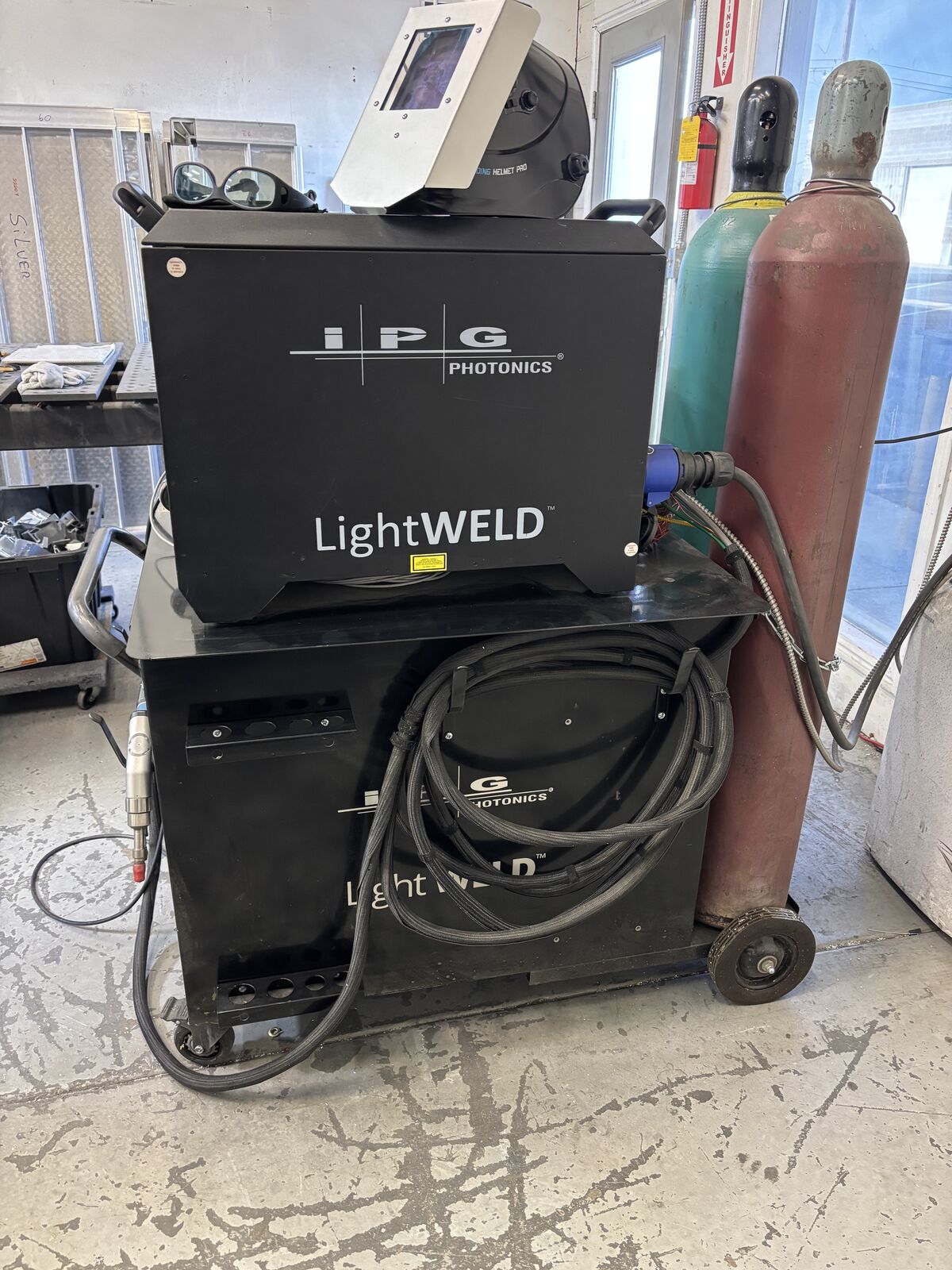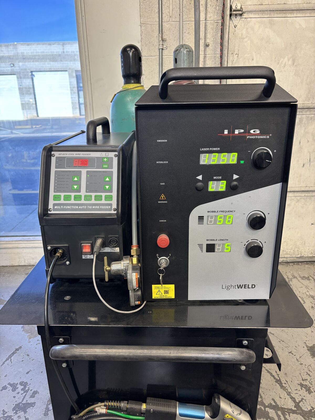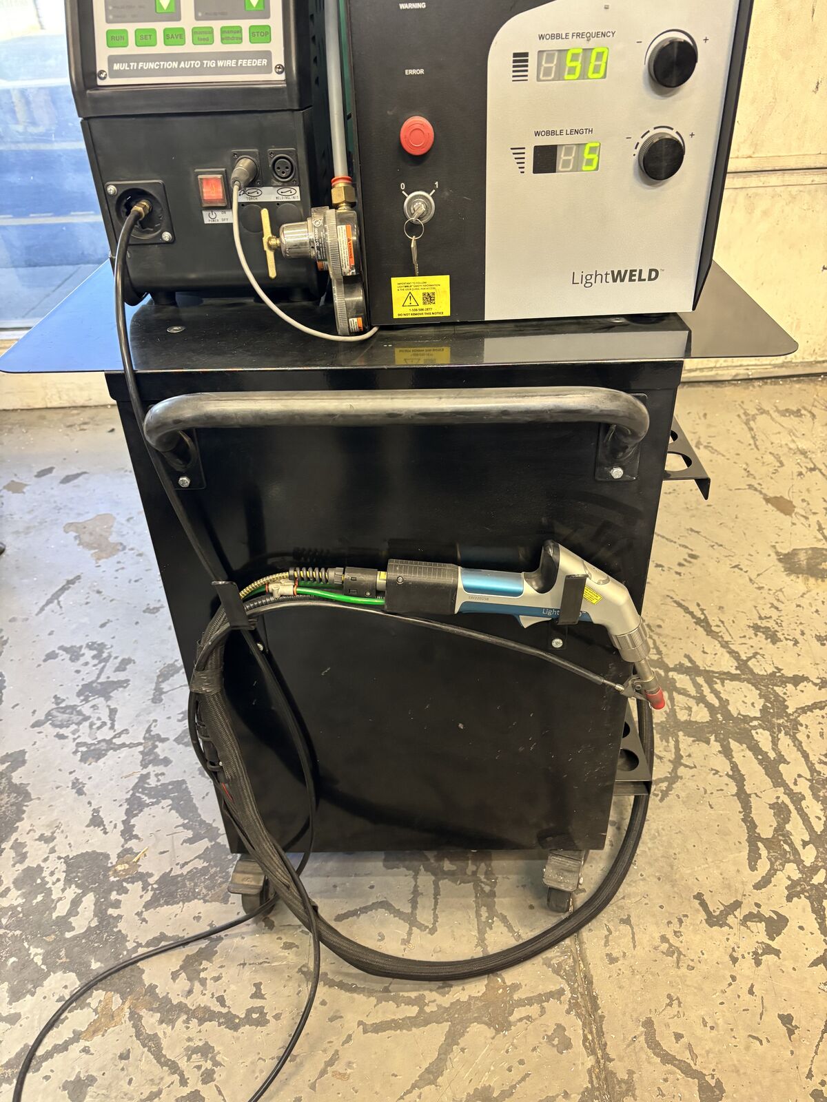 Less than 5 hours on this machine. Price Includes wire feeder, accessories, training in Salt Lake City. We have a cart that is in addition to the welder. The attached video shows its use and application. This technology uses a very small weld fillet and our application requires a larger fillet we get from a Mig.
