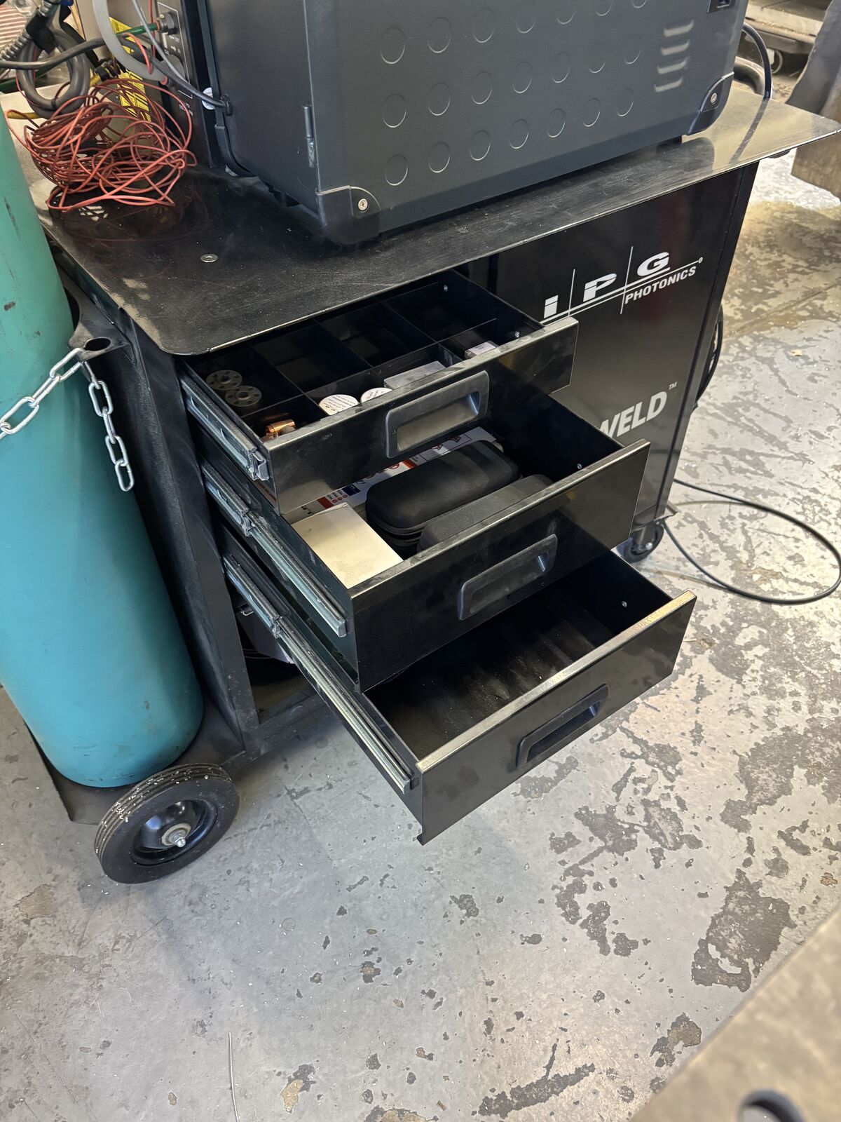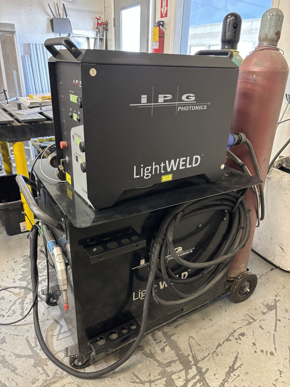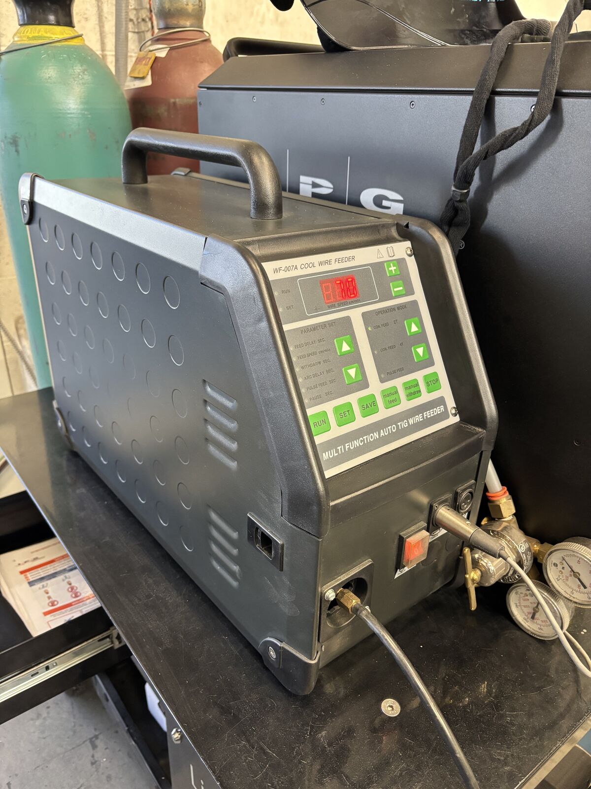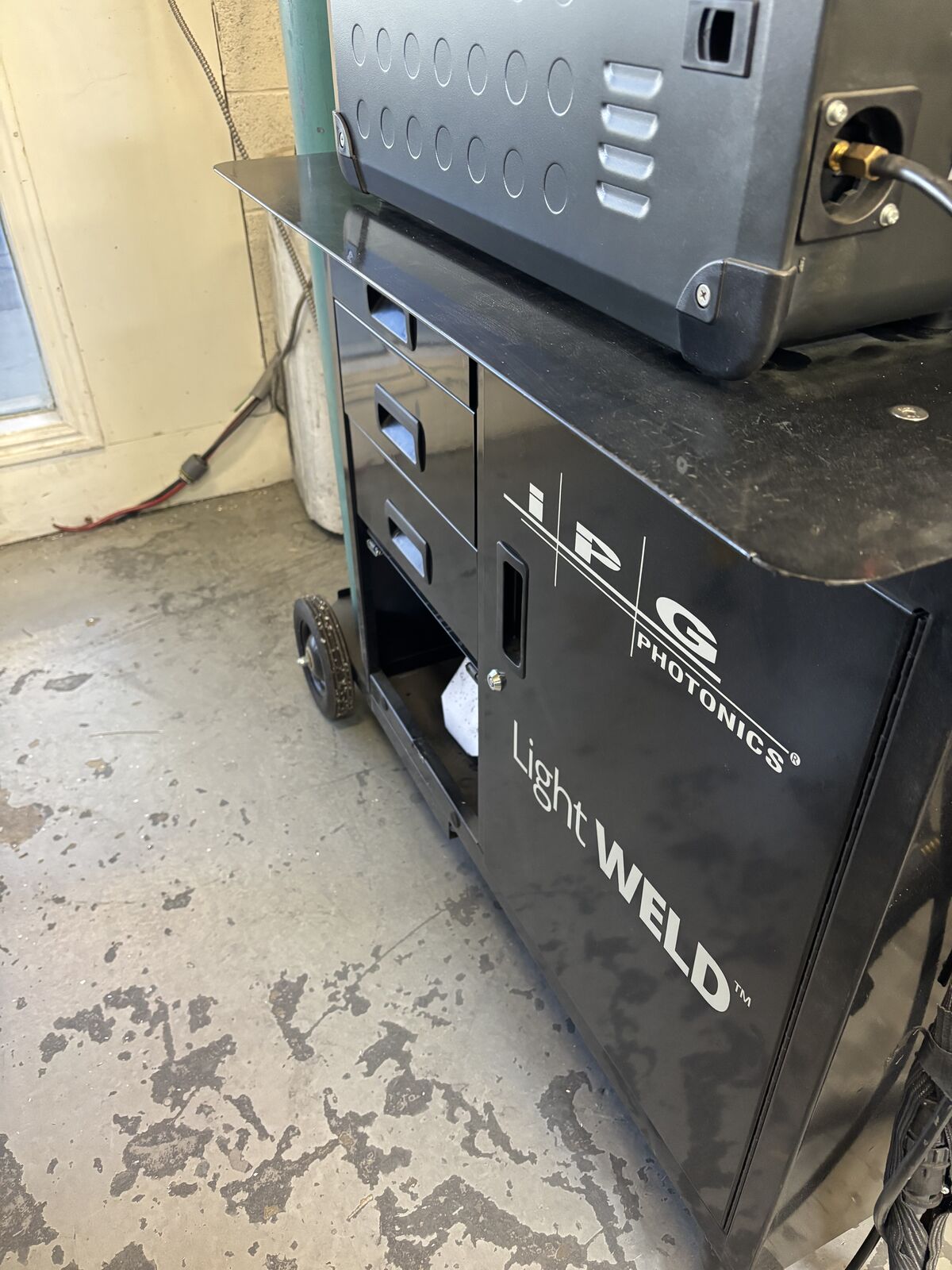 Less than 5 hours on this machine. Price Includes wire feeder, accessories, training in Salt Lake City. We have a cart that is in addition to the welder. The attached video shows its use and application. This technology uses a very small weld fillet and our application requires a larger fillet we get from a Mig.