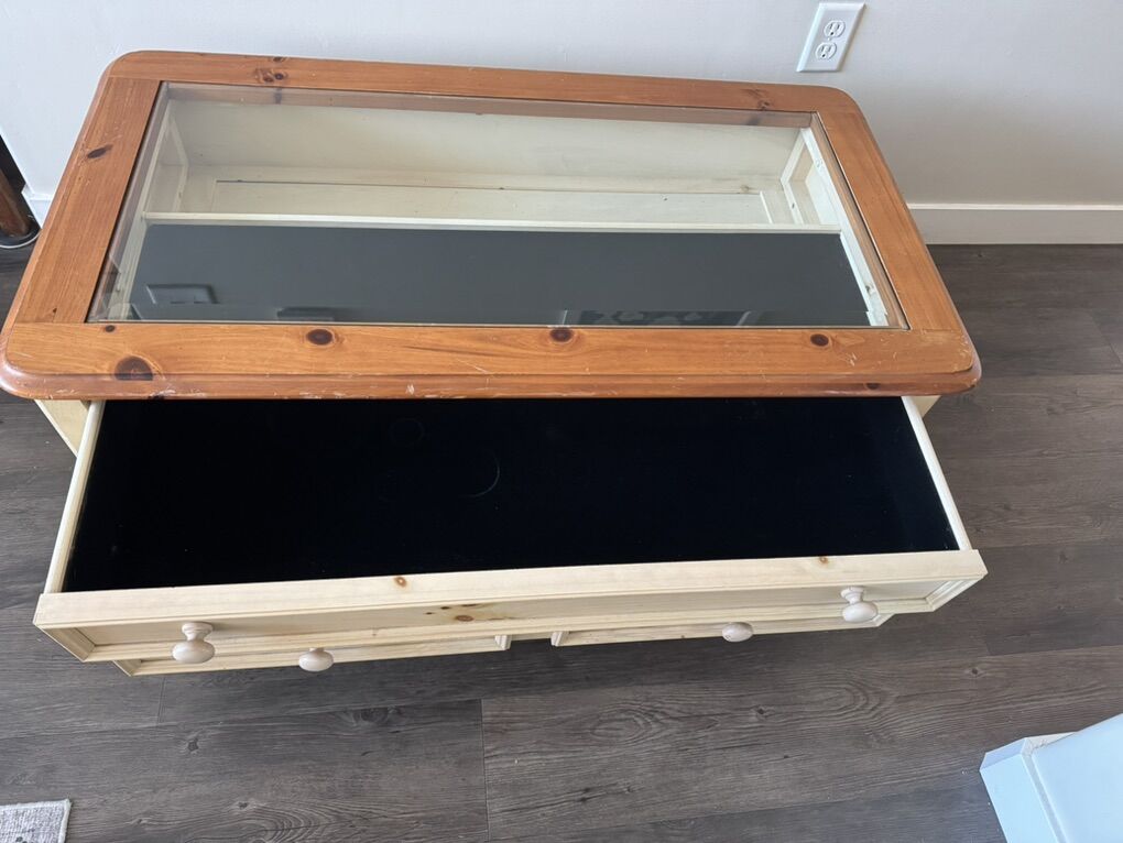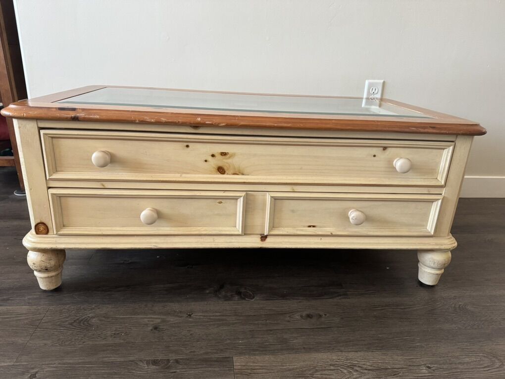 VenmoBeautiful matching 3 piece set of living room tables. Set 2 End Tables Dimensions: 21” wide x 25” Deep x 24” tall with one drawer each ($100/ea) Glass top Coffee Table Dimensions: 44” Wide x 25” deep x 18” tall. 2 drawers, top drawer has display. ($150)