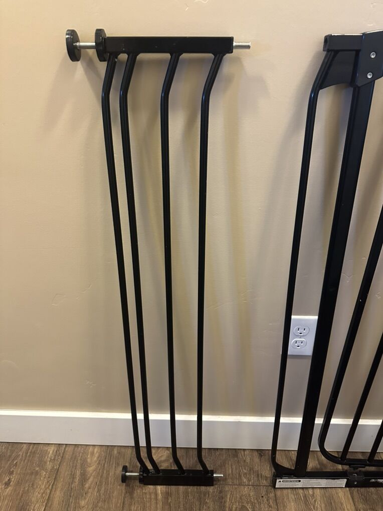 ApplePayDreambaby extra-wide metal safety gate with two matching extension panels. Solid steel construction with pressure-mounted design (no drilling required). From a smoke-free home. Suitable for wide openings, hallways, or stairs.