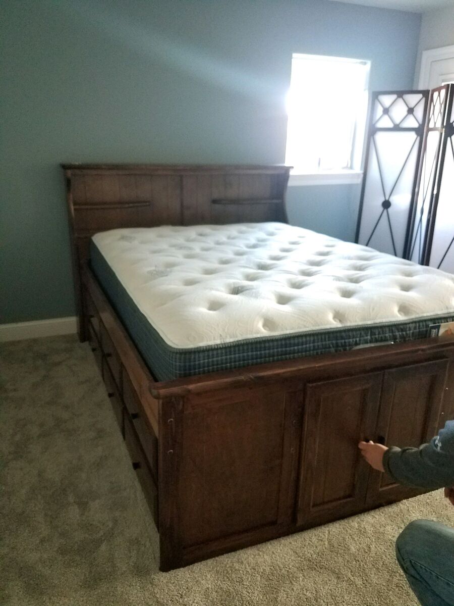 ZelleUsed like new queen sized platform bed frame with storage underneath. Bed frame is solid wood and in great condition! $800 but make me an offer! We don’t have the room anymore and need it gone.