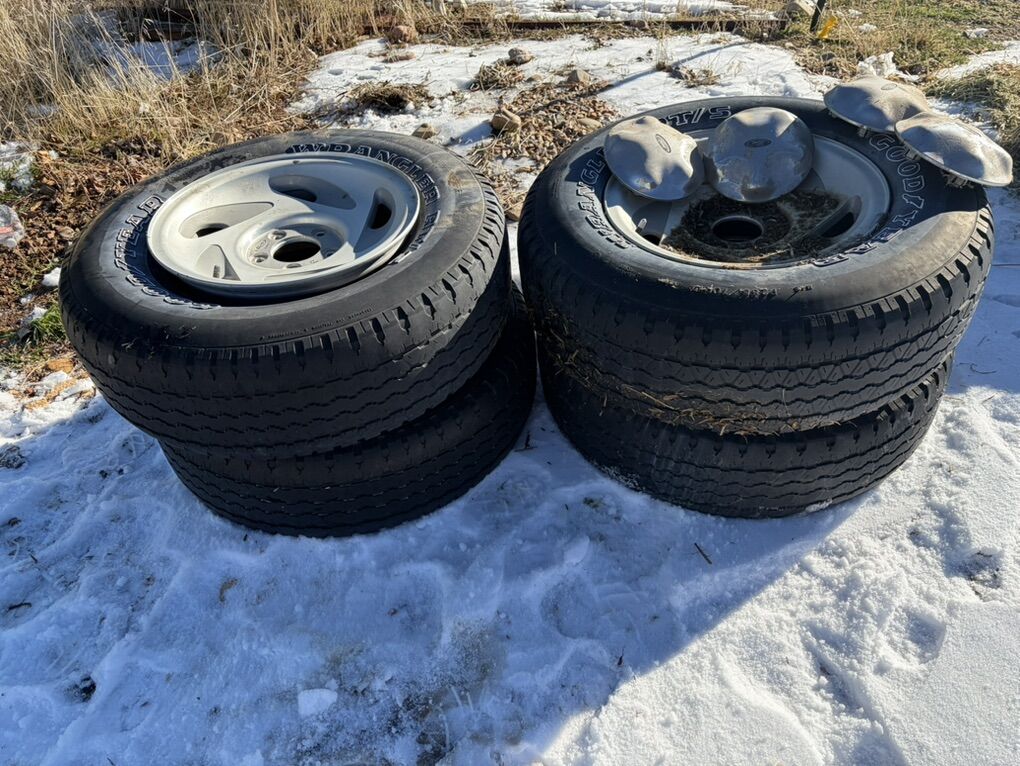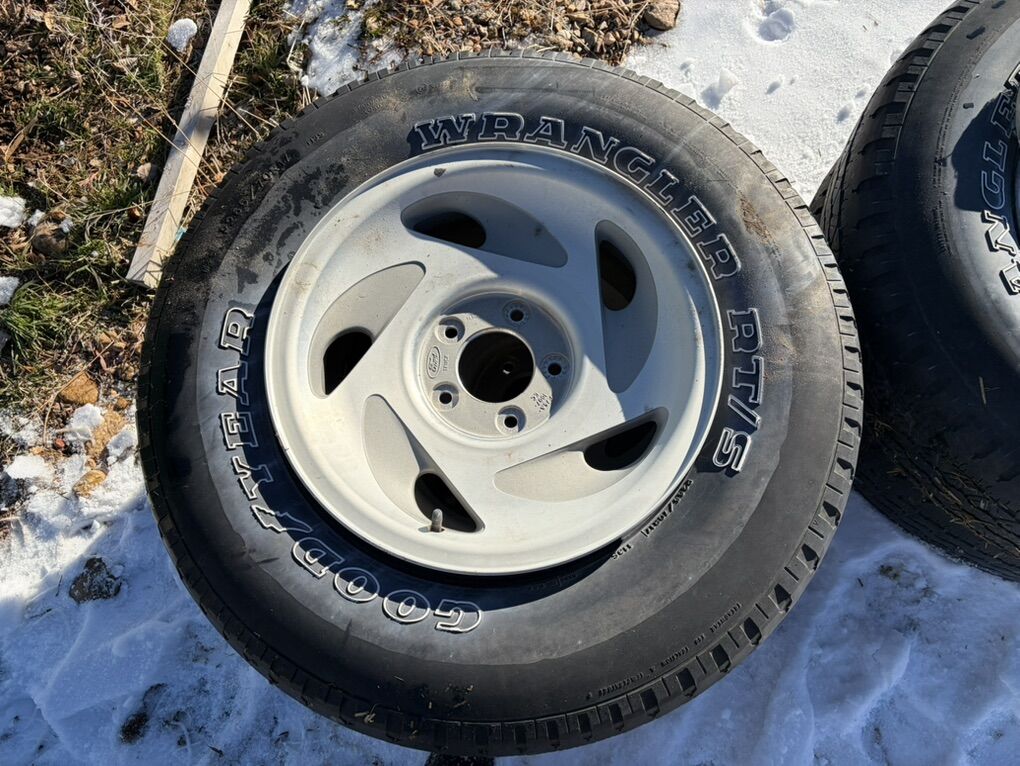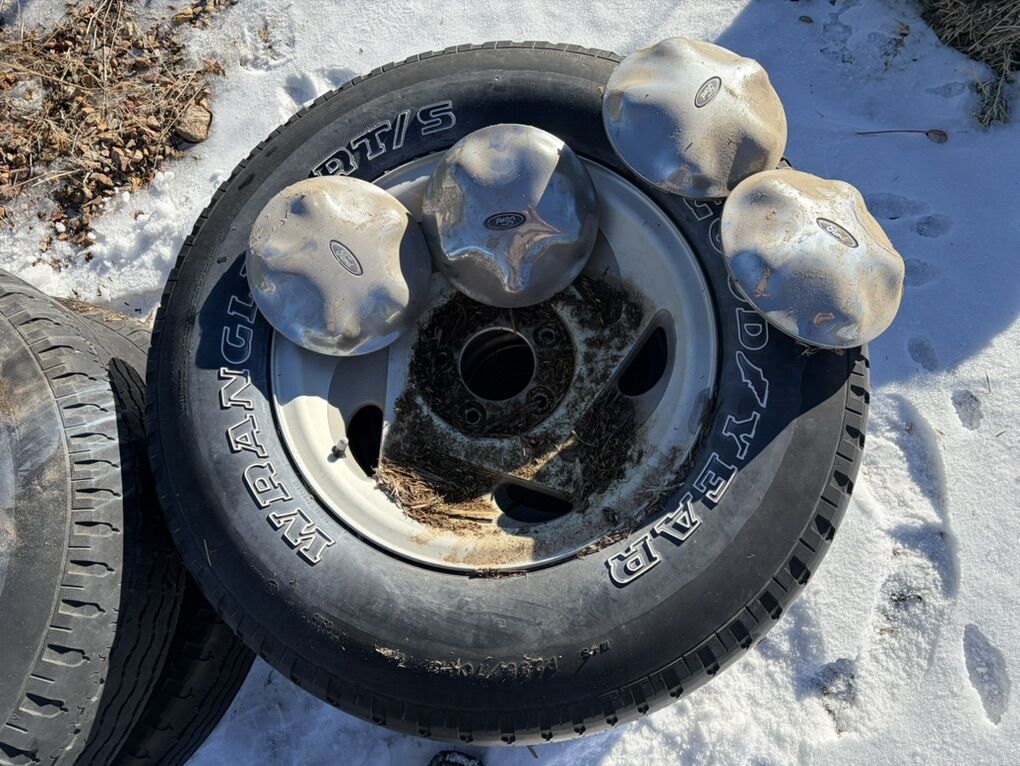 17” wheels 5 lug with old tires. Tires are not all good but one does hold air. Comes with caps. Came off a 2000 f150.