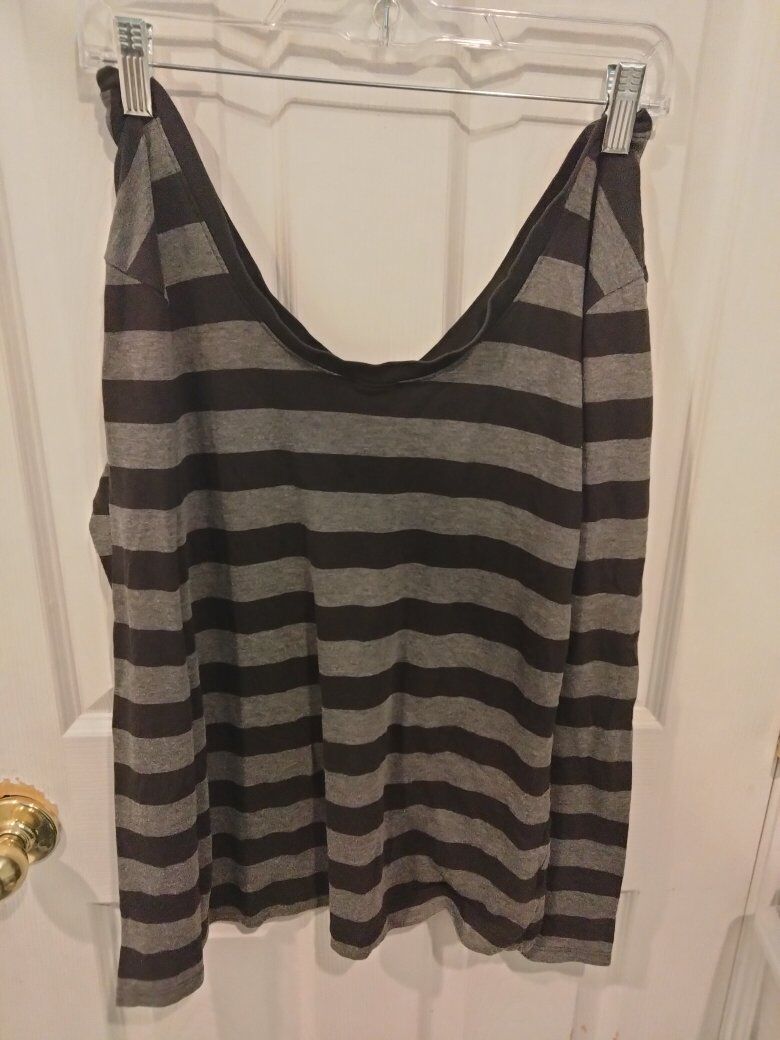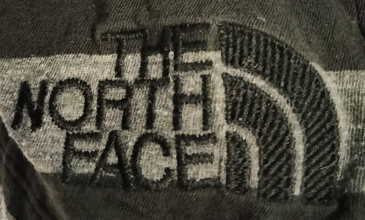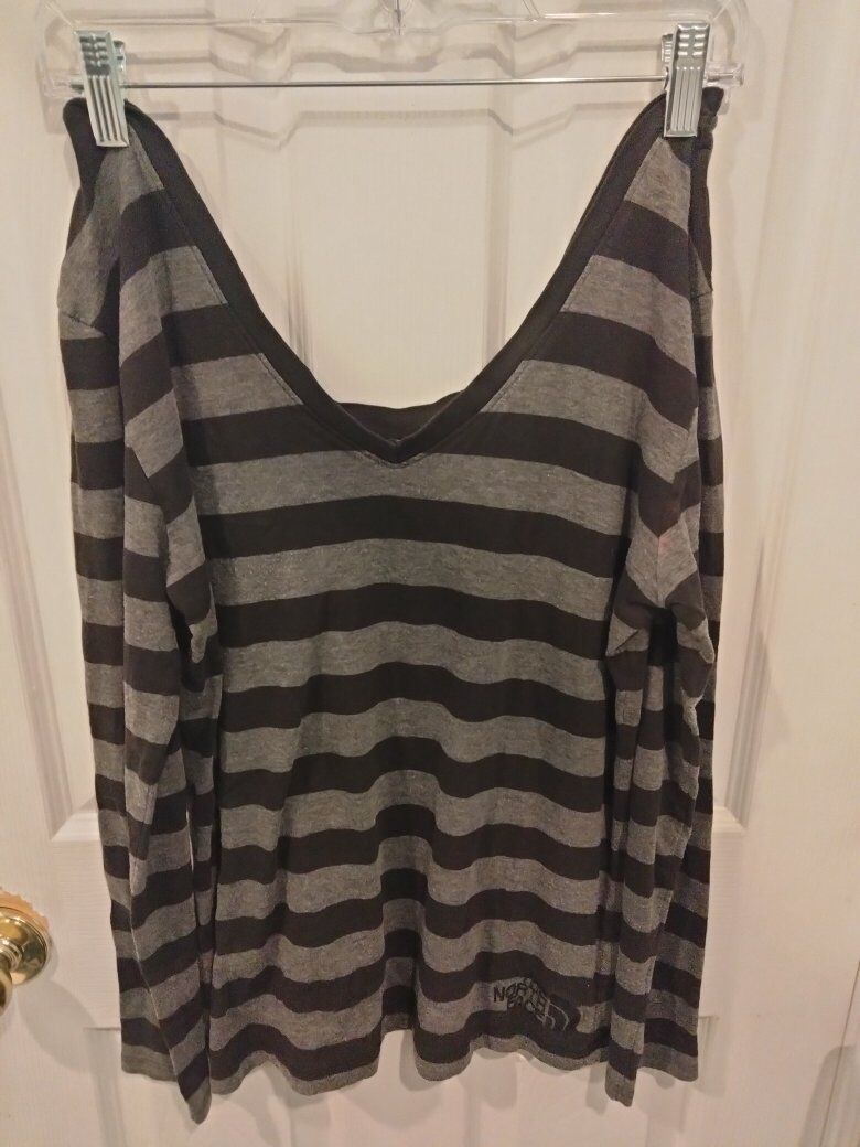 grey and black striped V-neck long-sleeve shirt with The North Face logo on the bottom right.