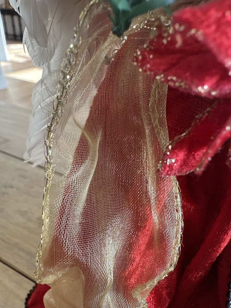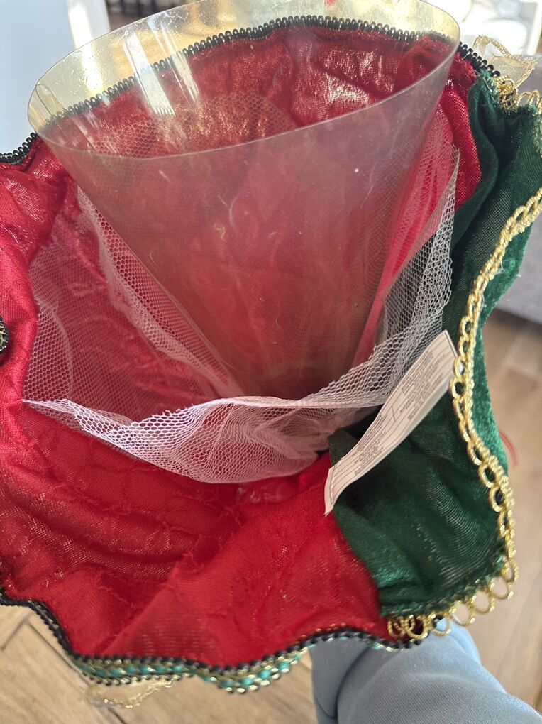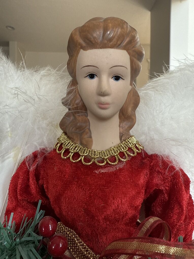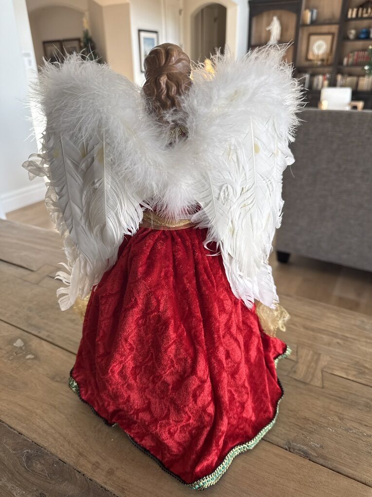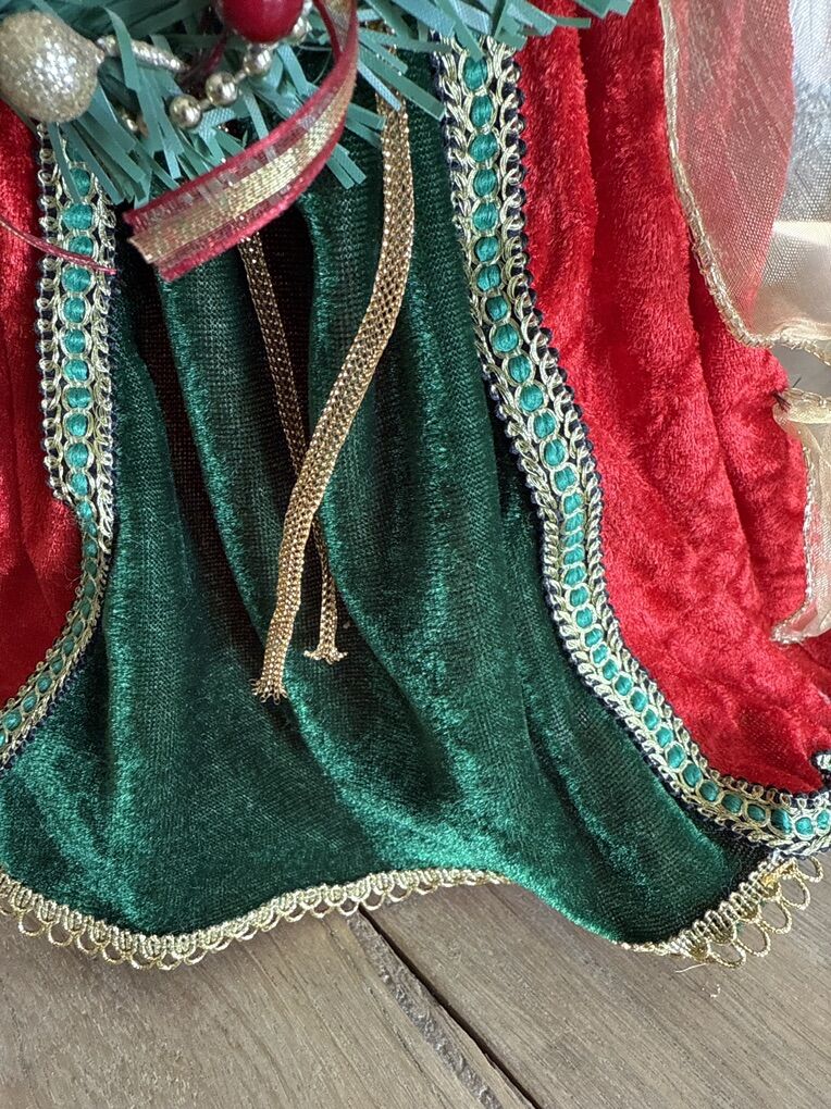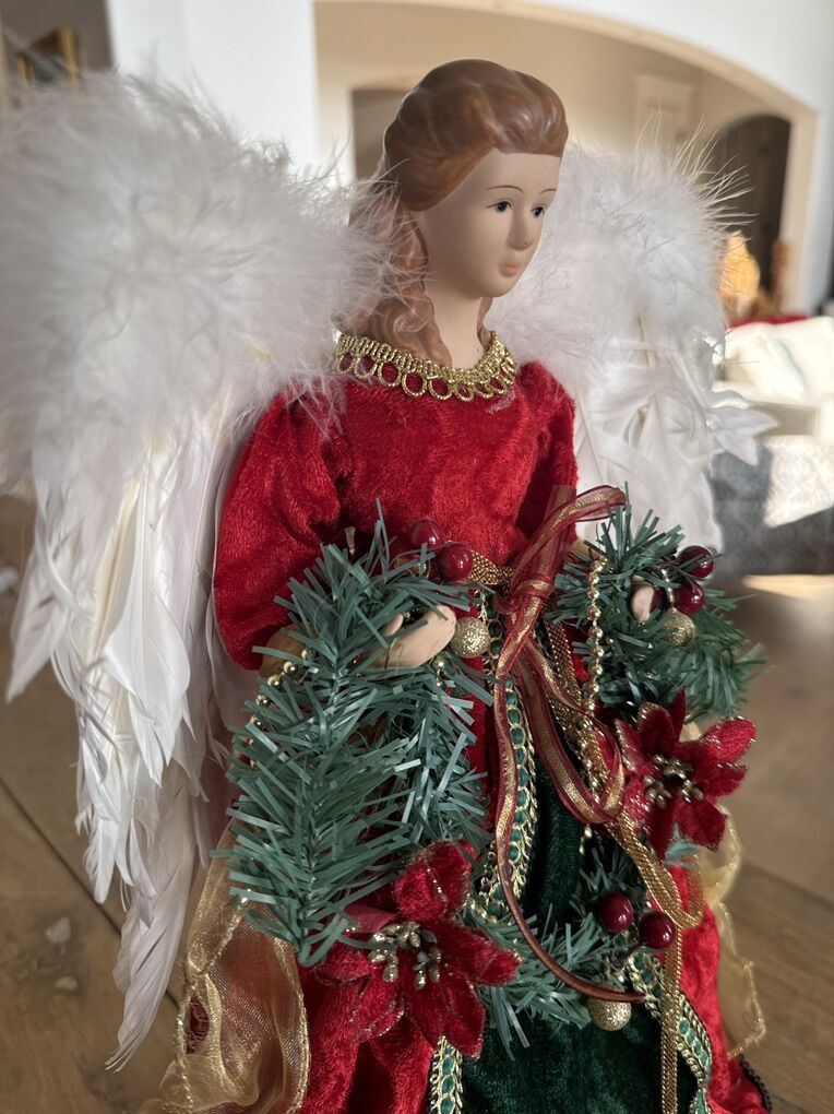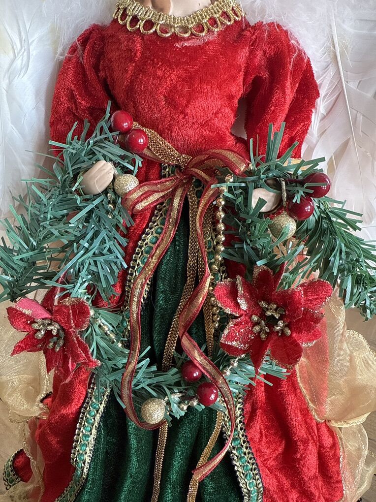 VenmoBeautiful angel holding a garland. Red and green velvety dress with gold trim. White feathery wings. Interior plastic cone. Perfect condition except for separation of gold ribbon edge below the angel's right hand (pictured). About 16 inches tall and 10 inches wide at the wings.