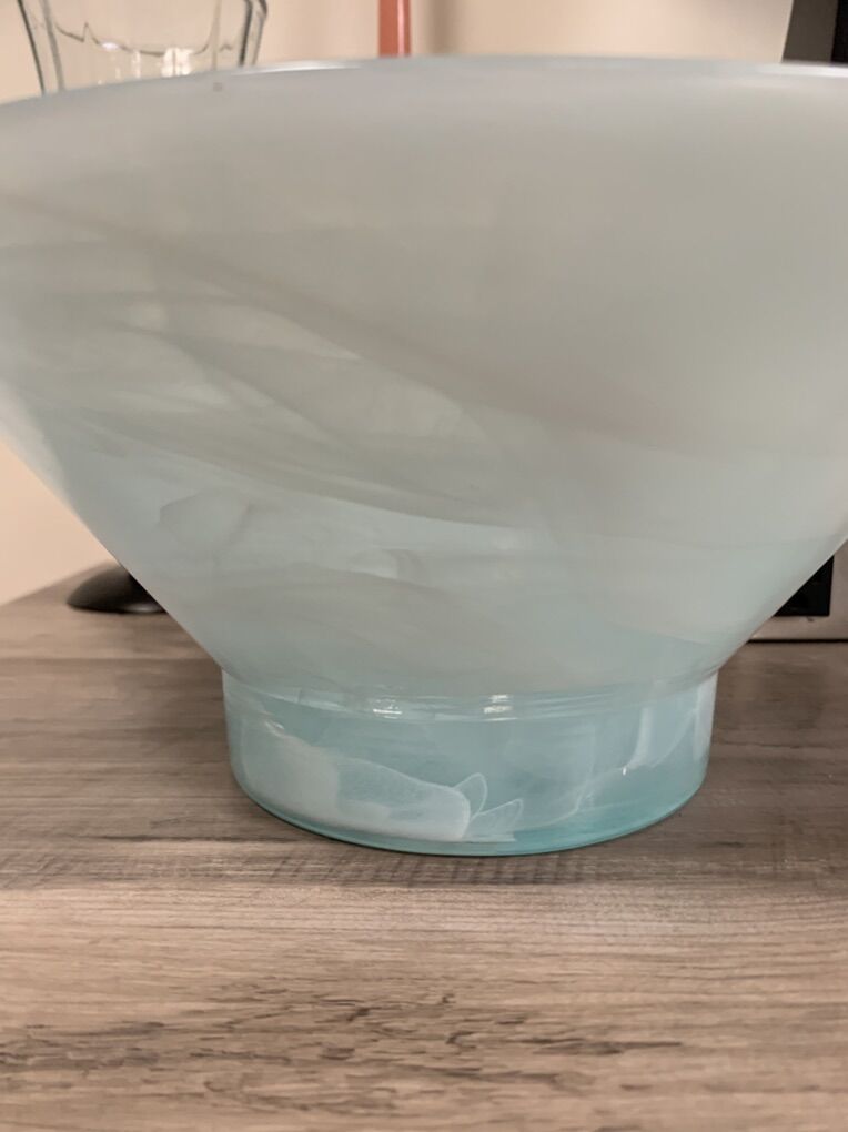 VenmoMade from Recycled Spanish glass. This decorative bowl measures 11 1/4” round a 5” base and 5 1/2”H. The beauty of this dish will make it a perfect serving bowl, table centerpiece or as a decor item. Clean and ready to go. Venmo or Cash. Non-smoking/No pet home.