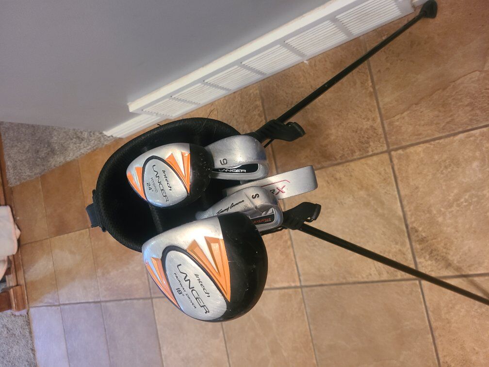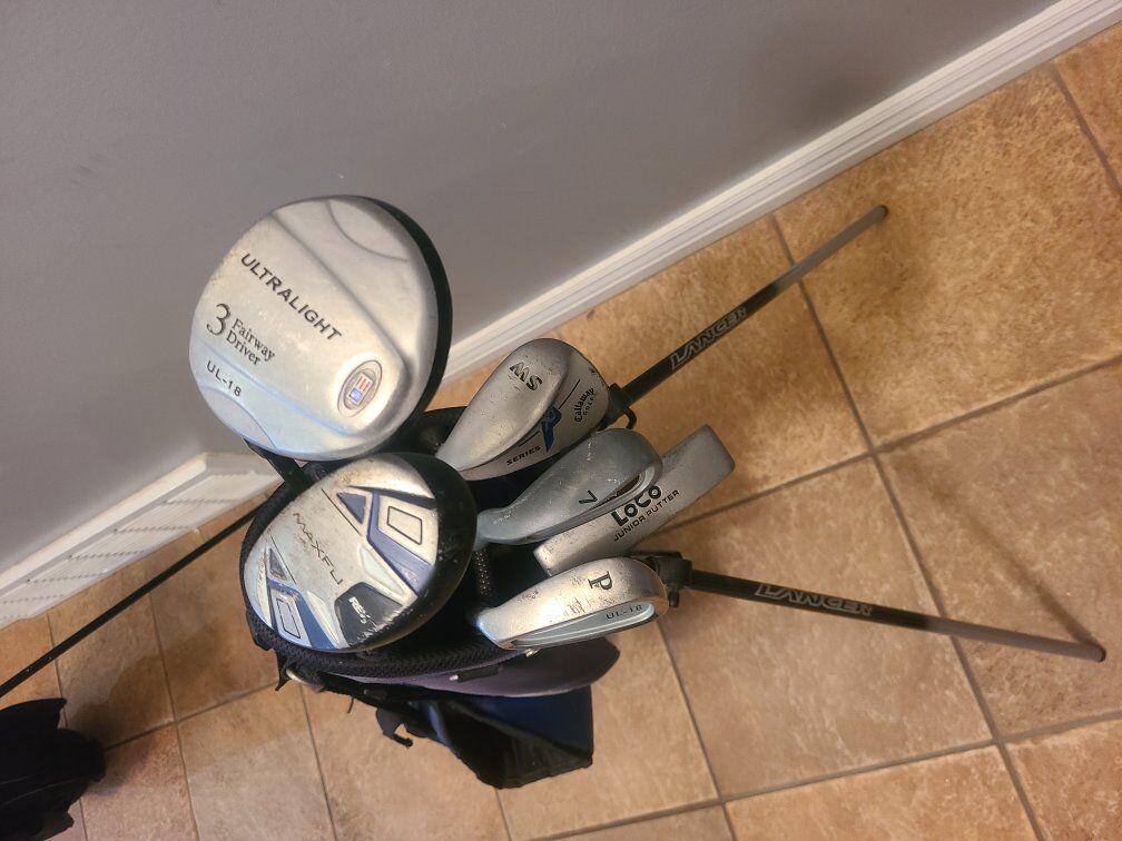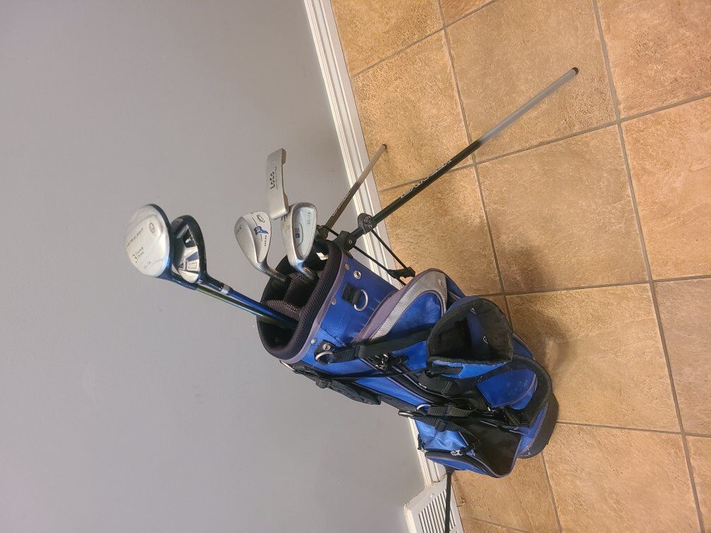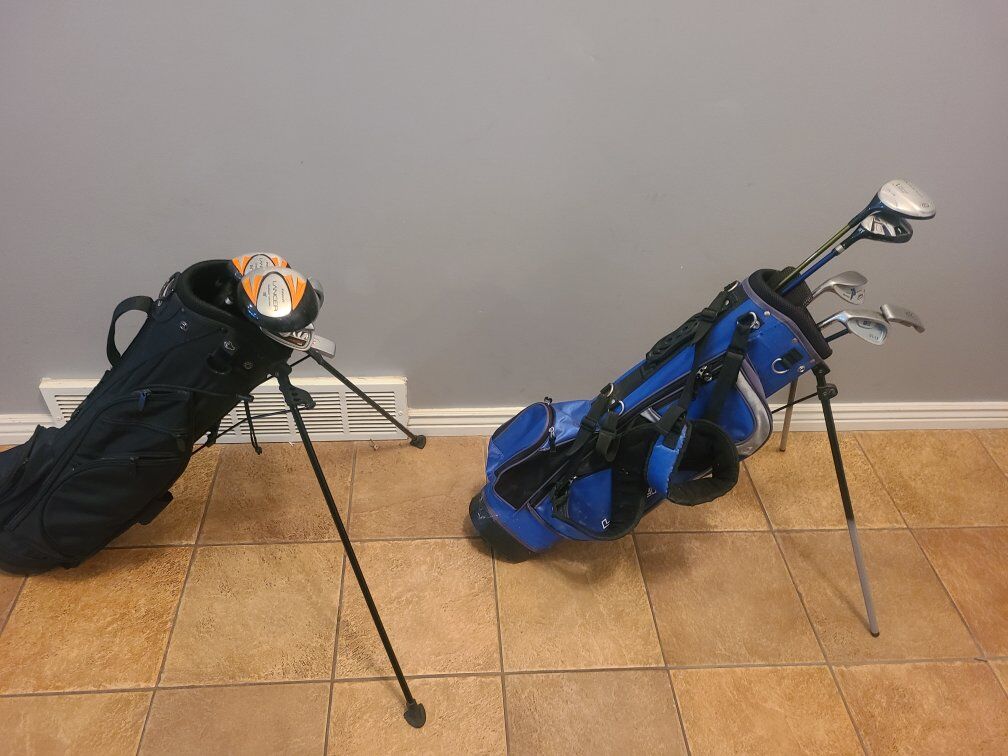 Blue bag on right with stand, comes with 39" driver, hybrid, pitch wedge, sand wedge, 7 iron, and putter.