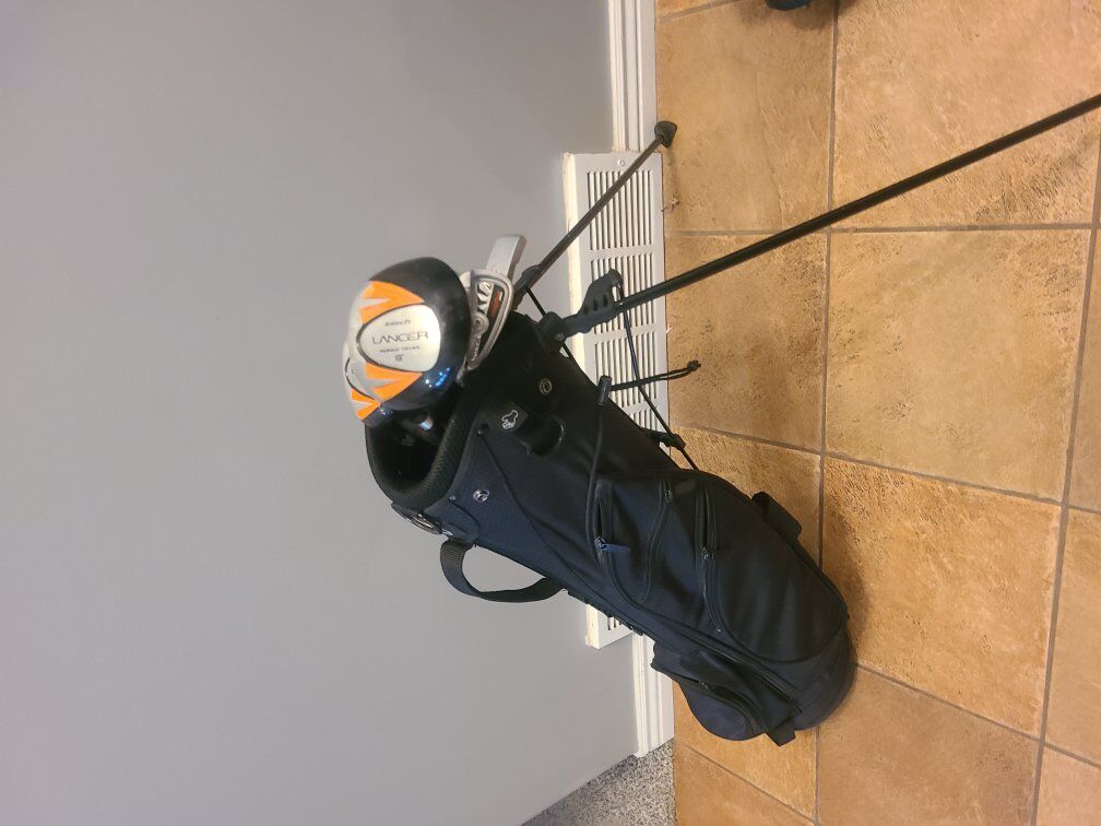 Black bag on left with stand, comes with 38" driver, hybrid, 9 iron, sand wedge, and putter.