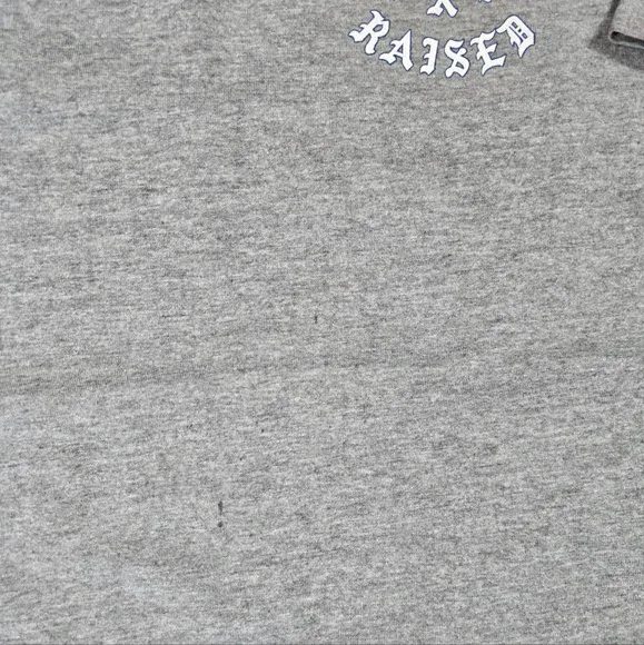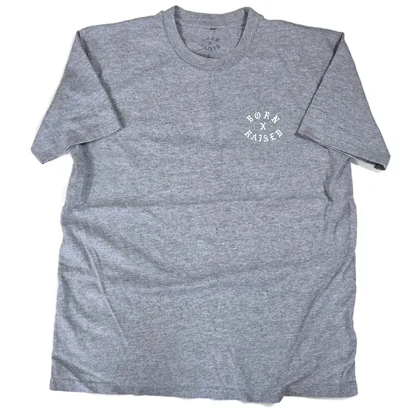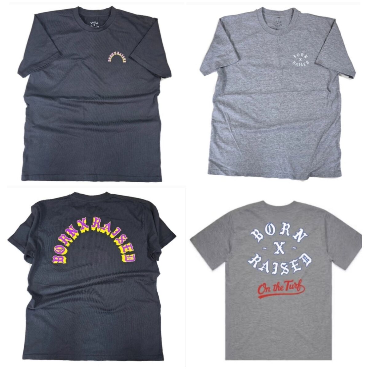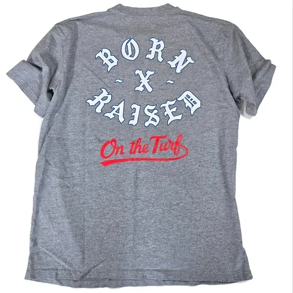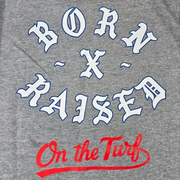 Born X Raised True Blue On The Turf LA Dodgers Colors Tee Gray, White, Red, Blue Large Previously owned, great condition - **see last two pics for small mark on left back sleeve, tiny mark on center front shirt 100% Cotton - machine wash Short sleeves Small logo graphic on front Large logo graphic on back - Rocker Tee Graphic/ On The Turf Pit to pit 22.5"/ Chest 45" Shoulder to hem length 29" Sleeve 8.5" 1951
