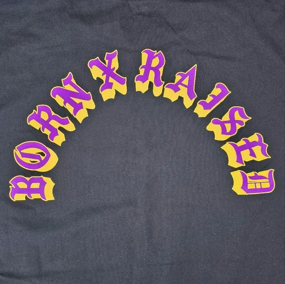 VenmoNEW Born X Raised Rocker Tee Lakers Colors Black Purple Gold Large New Without Tags 100% Cotton - machine wash Short sleeves Small logo graphic on front Large logo graphic on back Pit to pit 22.5"/ Chest 45" Shoulder to hem length 29" Sleeve 8.5" Thanks for shopping my closet :) 1950