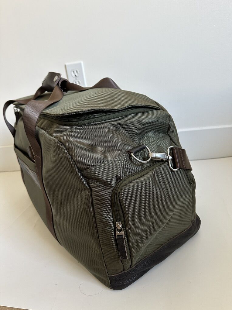 VenmoAbercrombie & Kent Green/Brown Safari Canvas Large Duffle Bag leather accent in good working condition.