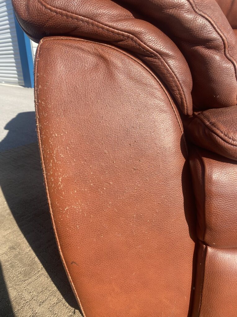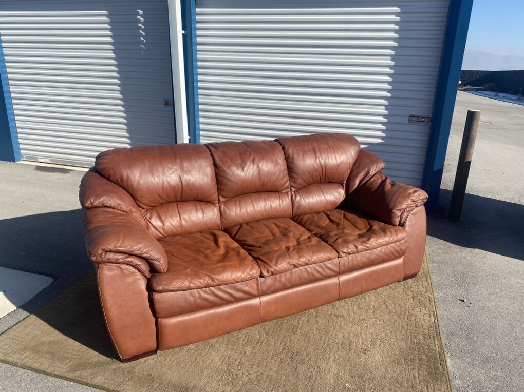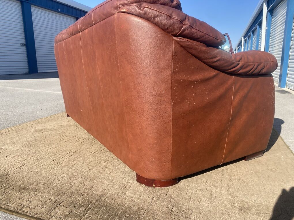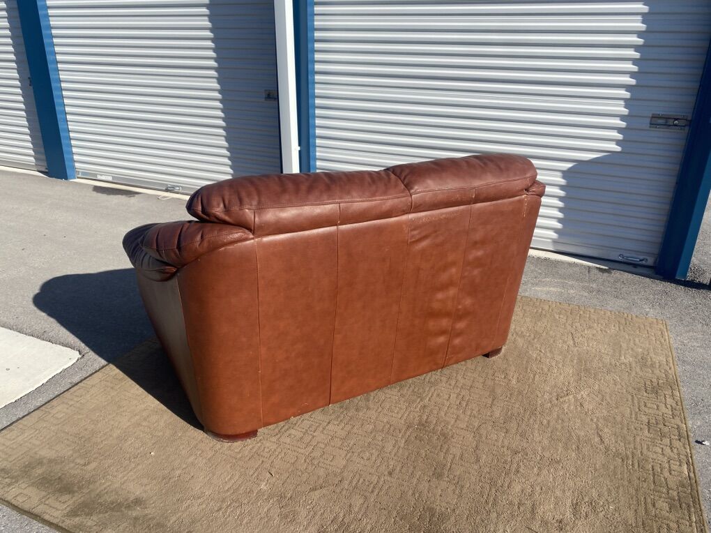 Real leather couch and matching loveseat. Both are comfortable and sturdy with good cushions and solid frames. Leather has visible wear and cat scratching on the arms/sides (see photos), but no major rips or holes.