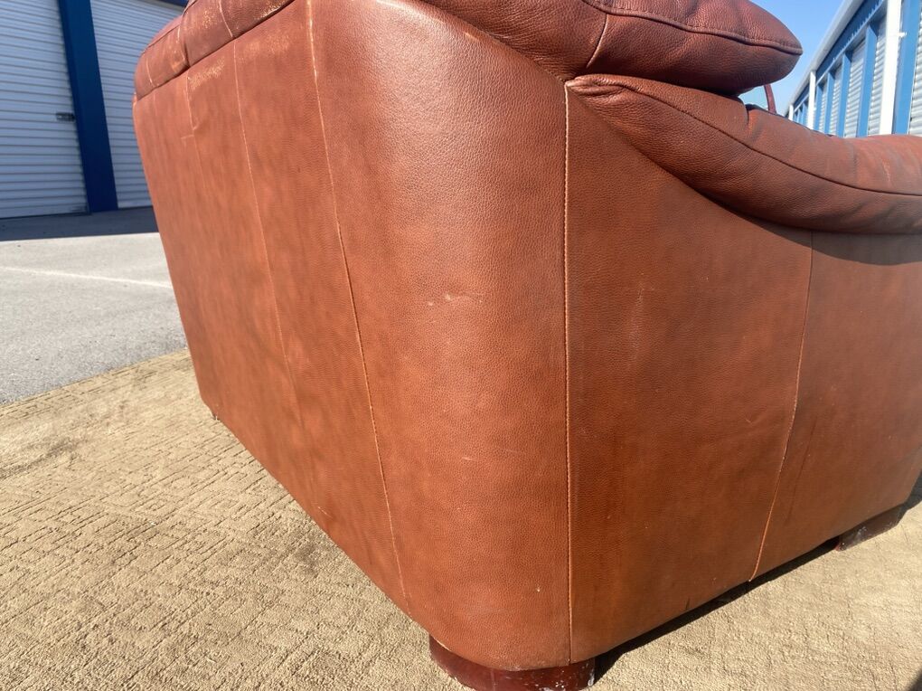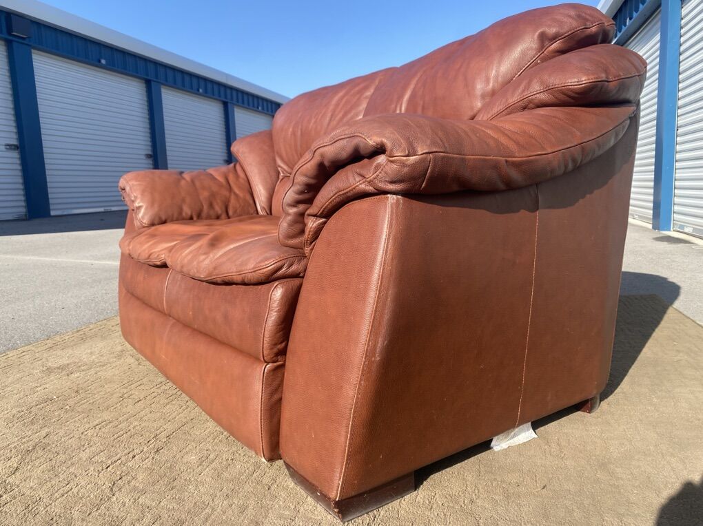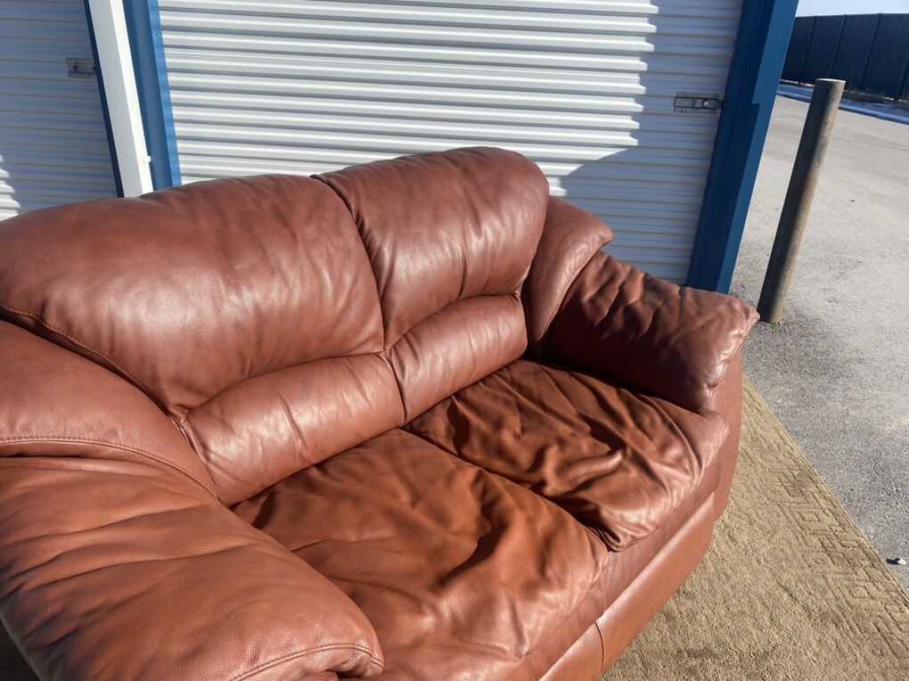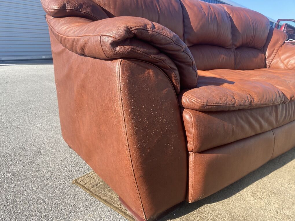 Real leather couch and matching loveseat. Both are comfortable and sturdy with good cushions and solid frames. Leather has visible wear and cat scratching on the arms/sides (see photos), but no major rips or holes.