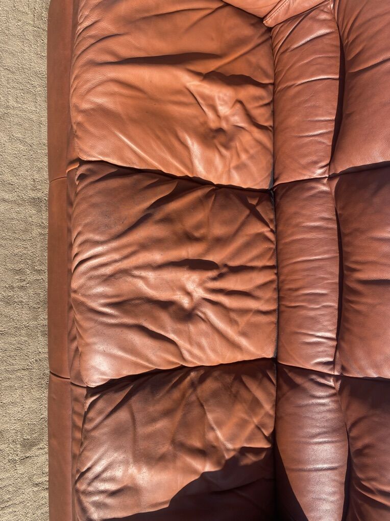 Color is a brown/cognac leather. Clean overall, just cosmetic wear from pets.