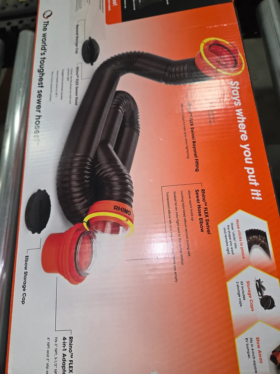 RhinoFLEX 15FT Sewer Hose Kit with 4 In 1 Elbow Caps. CamcoFTs RV RhinoFLEX 15FT Sewer Hose Kit with RhinoFlex Hose and Swivel Fittings features a super-tough bayonet fitting with four prongs for a more secure fit. At the dump-station end, weFTve added an easily detachable 4-in-1 translucent elbow adapter for fitting to 3in slip or 3in, 3-1/2in and 4in threaded pipes. ItFTs a ready-to-use kit made with 23 mils of the toughest hose you can buy. It includes a bayonet and elbow storage cap. The kit compresses to 56in for storage and the removable 4-in-1 adapter allows you to store the hose in 4 square bumpers.Features: Includes 15-foot RhinoFLEX sewer hose, swivel bayonet adapter, 4-in-1 translucent elbow, and two storage caps. Fittings swivel for ease of use and are detachable. RhinoFLEX sewer hose is made of 23 mils of durable polyolefin and reinforced with steel wire. 4-in-1 translucent elbow adapter fits 3in slip or 3in, 3-1/2in and 4in threaded dump-station pipes. Kit compresses to 56in for storage and the removable 4-in-1 adapter allows you to store the hose in 4in square bumpers. 177285 1-3-26 00.6 rt42