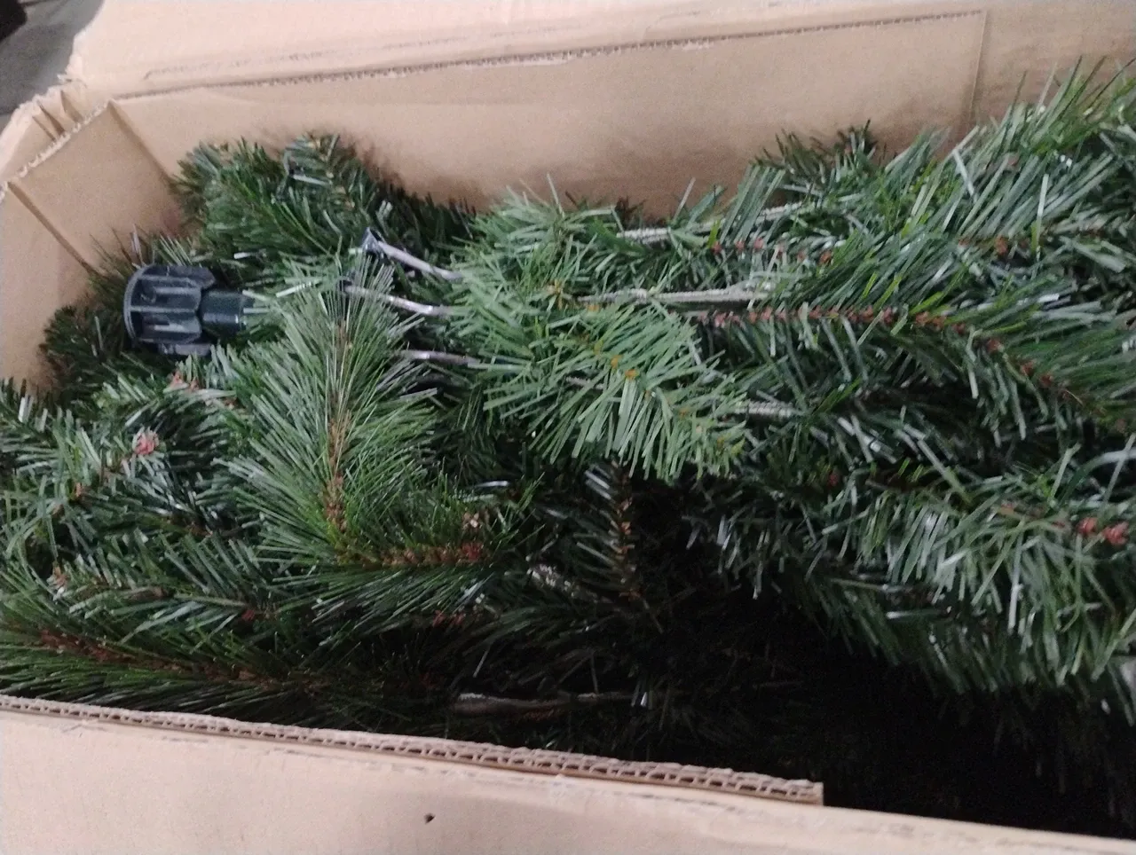 Its pre-attached hinged branches simplify setup”just slide the sections together and shape the branches to your liking. The tree includes an extra sturdy top branch to securely hold your preferred star, angel, or other tree topper. 176506 1-3-26 05.9 rt114
