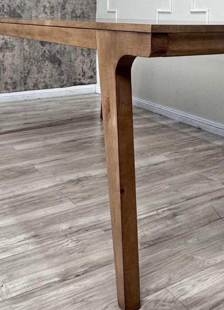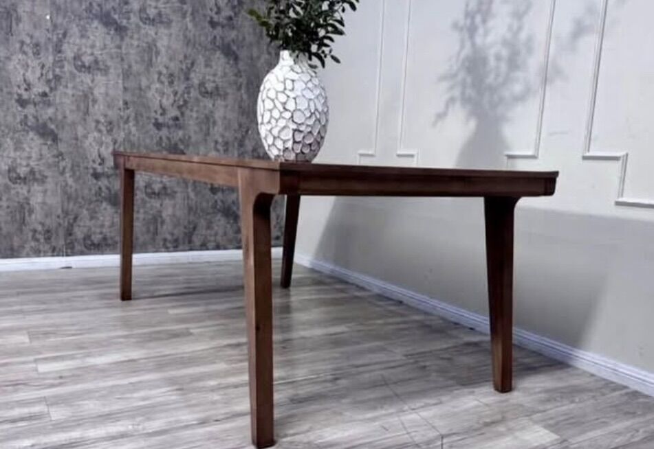 Our rectangular Brenden dining table is a modern dining room centerpiece in your choice of deep brown or natural finishes. The solid pine tabletop surface and legs are rich with natural graining that contrasts beautifully with a variety of dining chairs. Clean lines and angular legs add to the table's sleek yet versatile appeal.