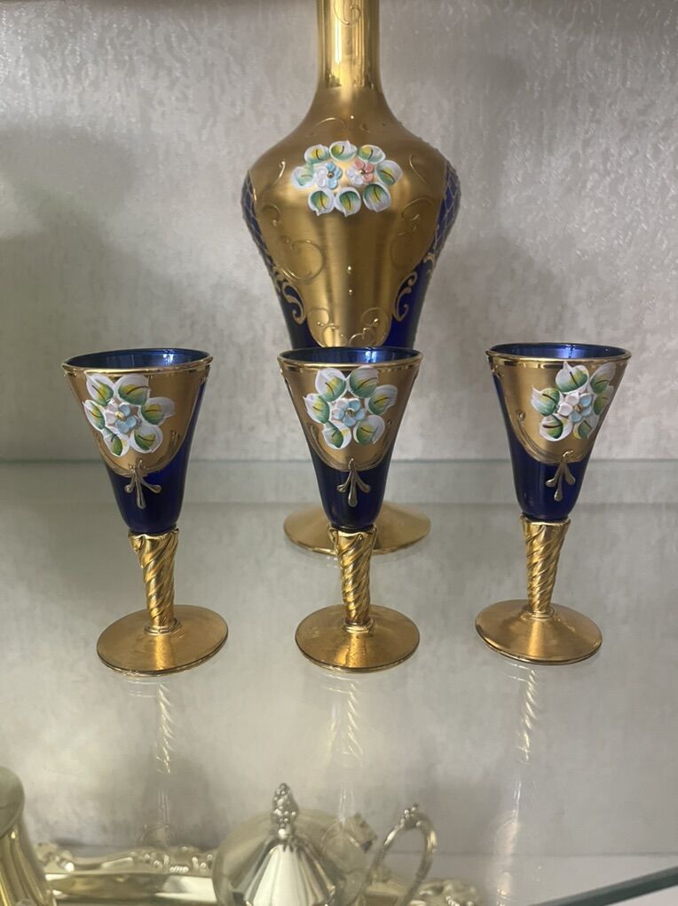 VenmoVenetian Murano Cobalt Blue Enameled Decanter and 3 Glasses 24k GOLD