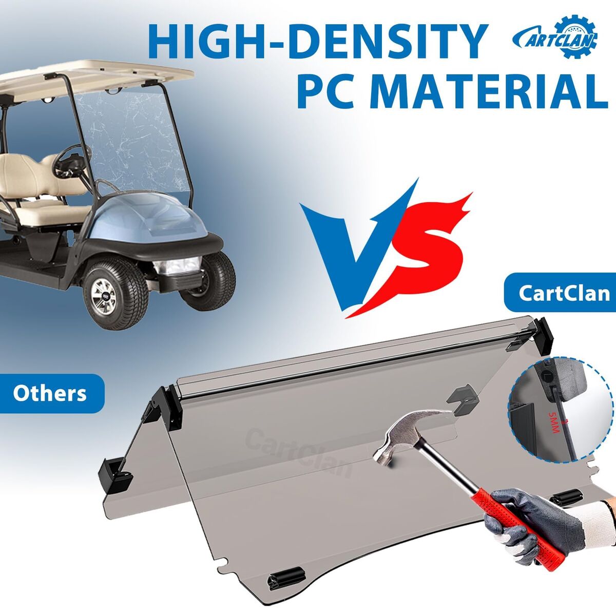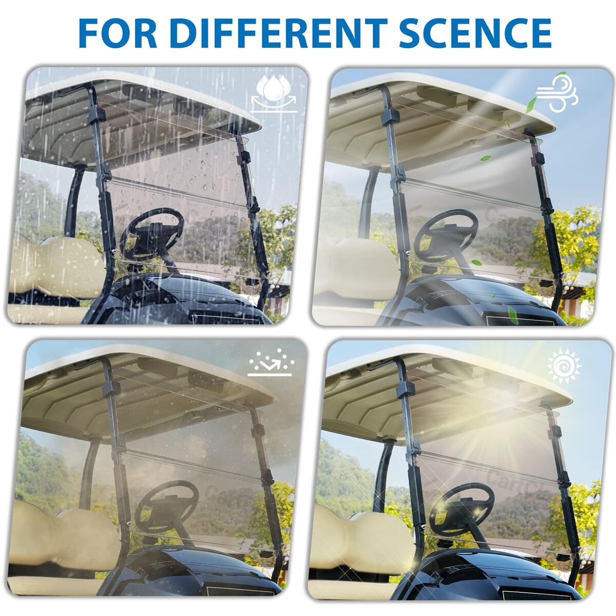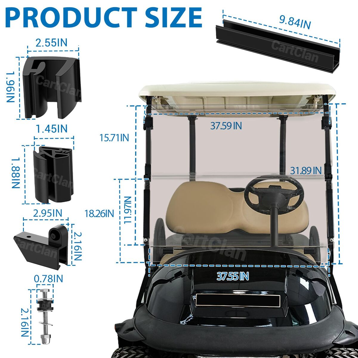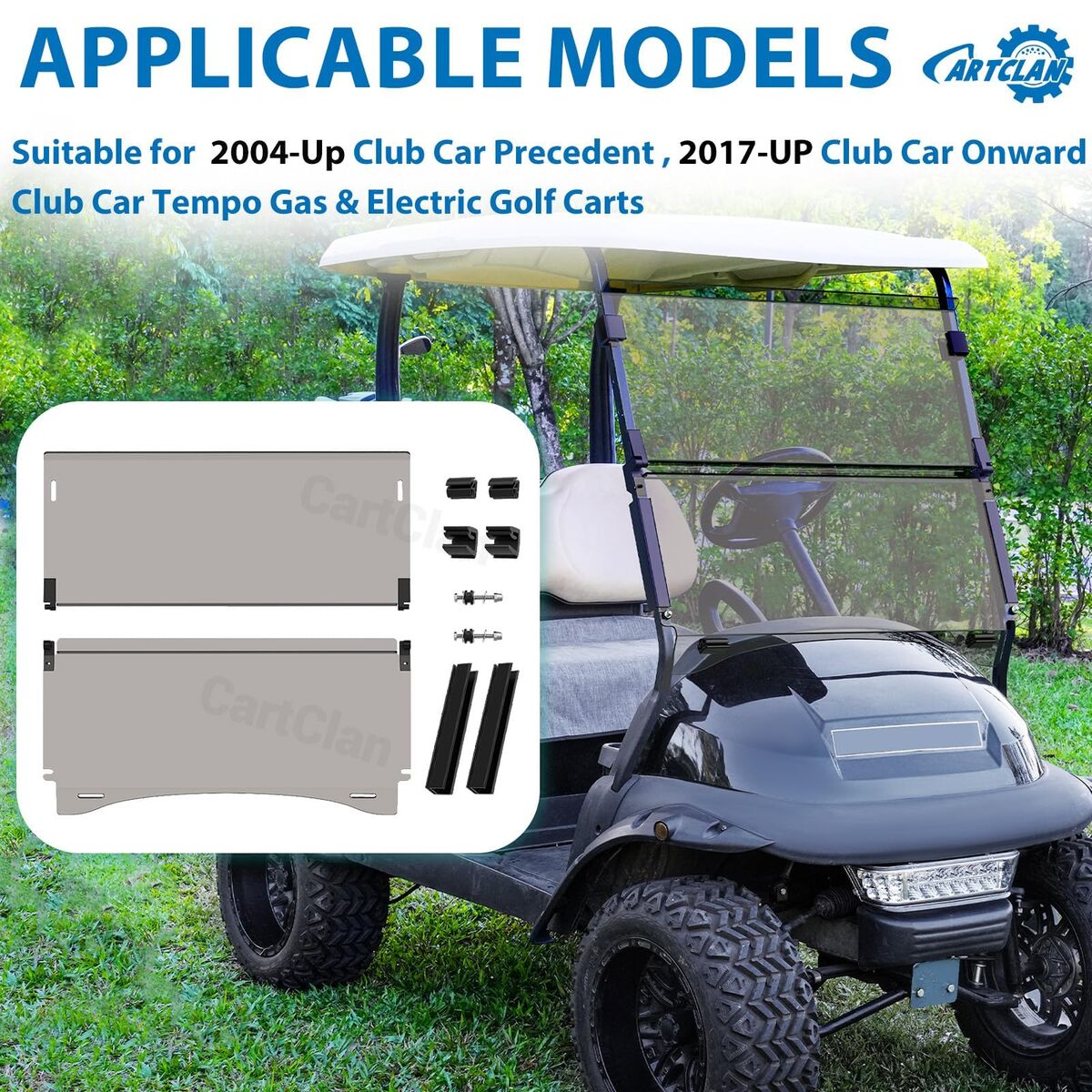 The tinted windshield is made of high-density PC material, which is stronger and more durable than ordinary golf cart windshields, while also having the features of glare reduction, anti-UV, wind and rain protection, and not easy to break CompatibilityGolf Cart Windshield Suitable for 2004-UP Club Car Precedent, Onward, Tempo Gas & Electric Golf Cart. (Note: Only suitable for golf carts with original glass, not for modified golf carts. Please confirm whether suitable before purhasing.) Folding DesignThe golf cart tinted windshield is designed with a folding design that can be easily folded in half. During hot summer days, the windshield can be folded down to ensure air circulation; during rainy days or cold winter days you can keep it standing, which can effectively block the rain or cold air Easy to InstallEasy installation, completed in less than 5 minutes, no drilling or other tools required. (Note: To avoid damage during transportation, the windshield is covered with a protective film, please take it off before installation.) CartClanWe are standing behind our products. If you are not sure if the Club Car Precedent Tinted Windshield Kit is compatible with your golf cart or suggestions, please let us know at any time and we will fix it in time 154326 12-9-25 00.3 rt103