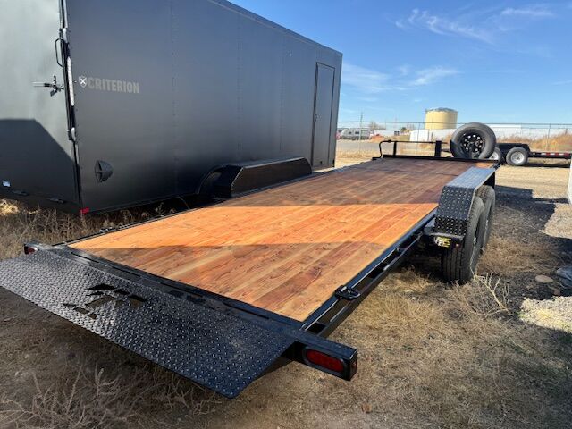 7x22 Teton tilt deck trailer. Tandem 7K, 4" drop axles w/ EZ lube hubs and adjustable electric brakes, spare mount, 12k drop leg side wind jack, 8" x 11.5lb headache rack, 2"x5"x3/16" tube subframe, soft close cushion ram, weld-on reinforced fenders, wire conduit throughout, 83" between fenders, 3/8" knife edge diamond plate beavertail, 4"x3"x.188" solid left to right rear tube bumper, 10-ply standard no excuses guarantee radial tires, logo diamond plate step, structural reinforced gusset, sure-lock 1" dual locking rod system, 3" channel crossmembers 16" on center, LED bullet lights throughout, 4 D-ring tiedowns, 3/8"x2" rubrail, stake pockets, 1.5" SCH 80 piped chain downs, breakaway battery kit stored inside lockable 12ga formed chain box-out of elements, 2"x5"x3/16" tube frame, 2 5/16" adjustable coupler, 3-year manufacturer warranty, $8100 plus fees.