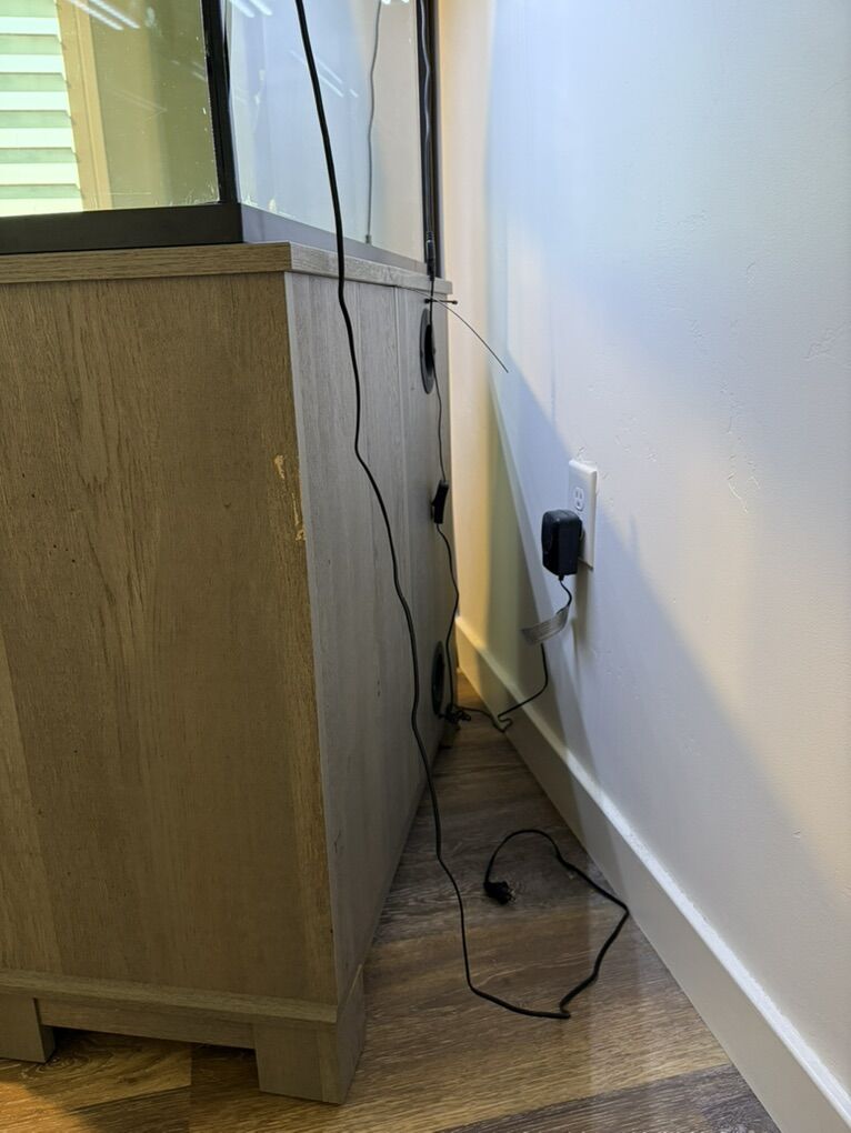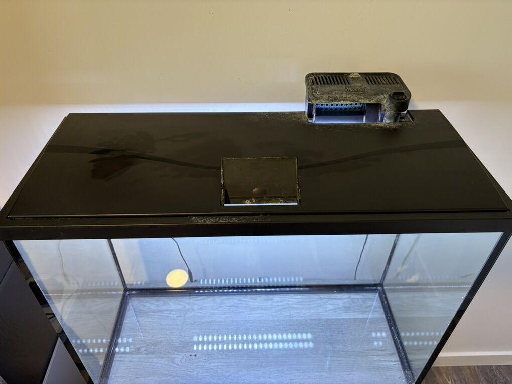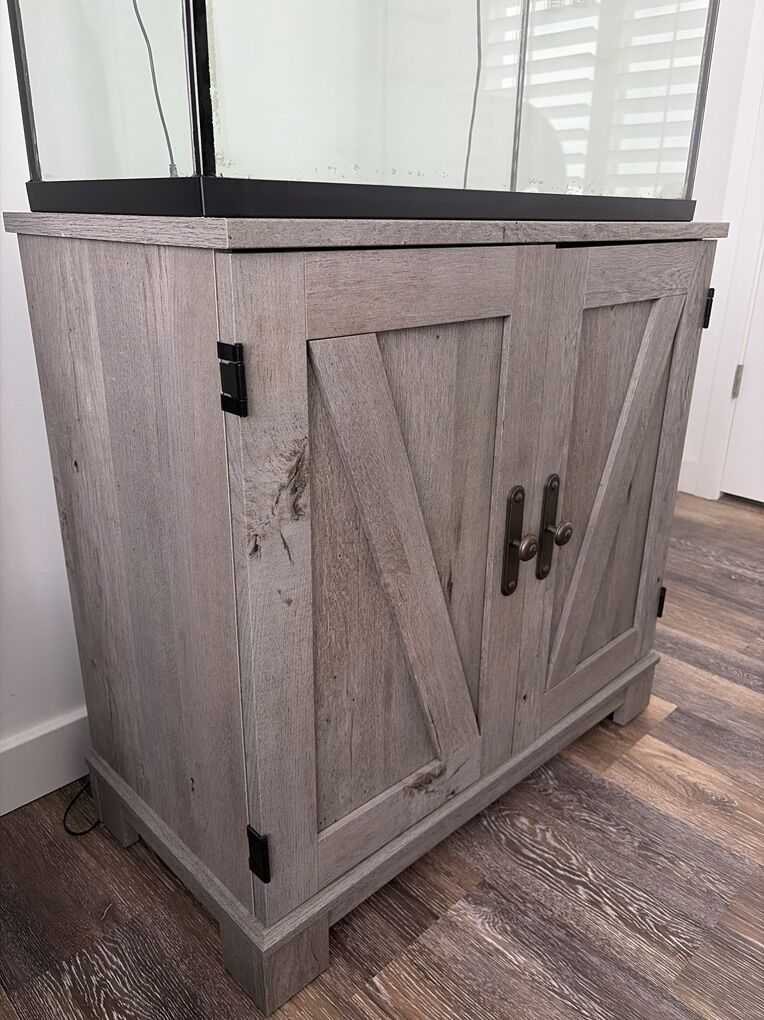 TopFin aquarium. Tank Size: 37 Gallons; 30 in L x 12 in W x 22 in H. Stand dimensions: 30.6 in W X 15.7 in D X 30 in H (77.8 X 39.8 X 76.2 cm) This aquarium has a capacity of 37 gallons (No leaks), and comes with a variety of components including LED Lighting, heater, power filter and all other items pictured in the cabinet if desired. -Automatic feeder -Few decorations -Water Care chemicals -Scrubbers -Siphon (For cleaning) -Bucket -Fish nets The filter works well and we’ve never had any problems with it. It does have some pretty gnarly hard water buildup on it but the inner workings operate as intended. The fish tank stand is a grey oak color. Everything sold as a set. We have gotten three years of use out of it. We just had a baby and we no longer have space or time to maintain our fish tank. Let me know if you have any questions.