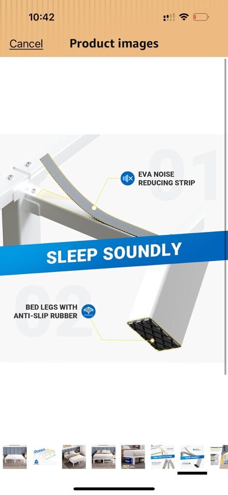 White Queen Bed - has solid wood white headboard with Sturdy white metal bed frame. Has noise-reducing strip and anti-slip legs. Made from high-quality metal with thickened steel tubes for stability. Allows for plenty of room underneath for storage. Sturdy Platform style bedframe that does not require a boxspring.