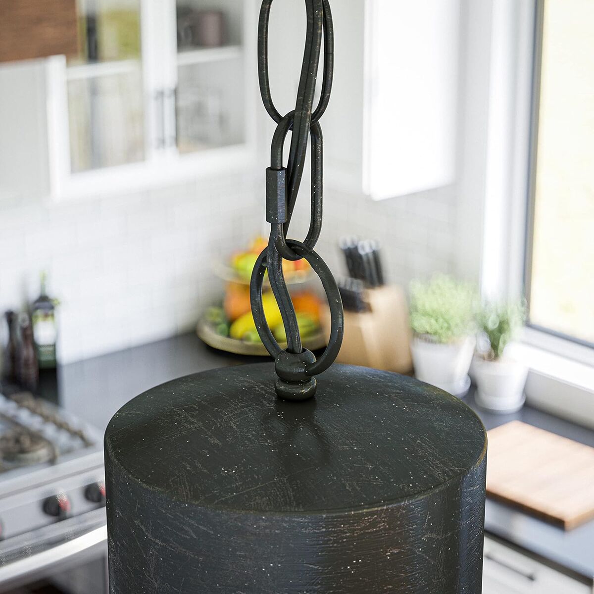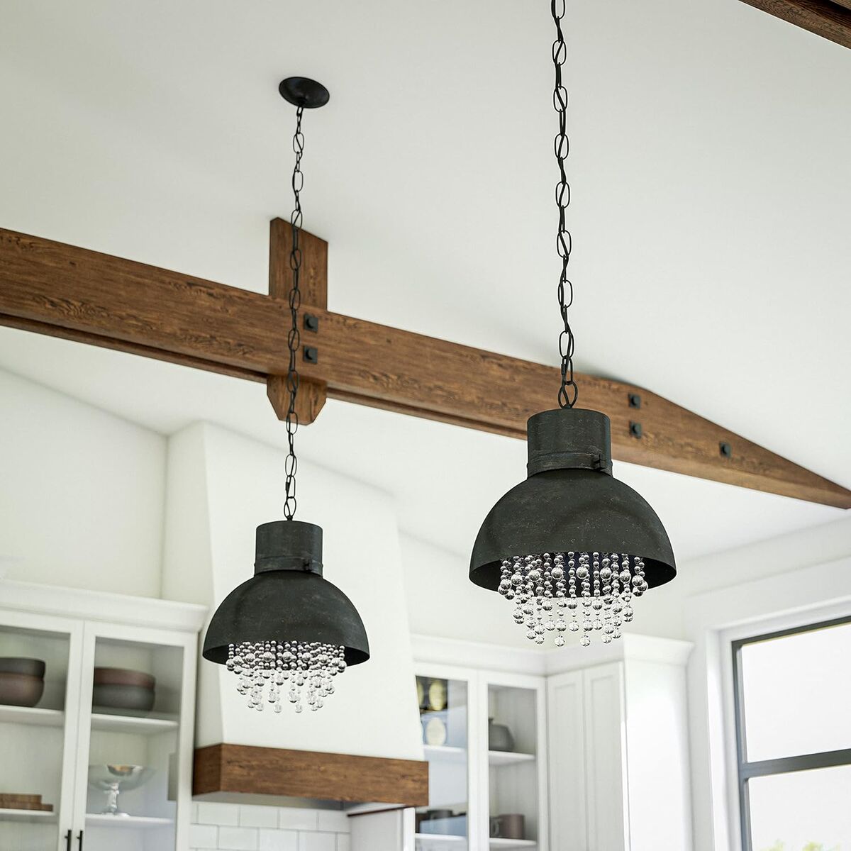 INDUSTRIAL GLAMOUR: a little bit coastal and a little bit rock n’ roll, the gorgeously detailed bowl-shaped pendant features a unique weathered metal finish, adding a rustic nuance to the coastal inspired shape of the pendant housing; fusing the style of rustic and glamour into one cohesive design are a series of sparkling crystal beads that act as a luxe inspired shade DIMENSIONS: 19-inch height, 14-inch diameter LIGHTING PROFILE: requires (1) 100-watt medium based bulb; excellent for downlighting and small area illumination; the crystal beaded accents provide a sparkling touch VAULTED CEILING COMPATIBLE: Adjustable height chain makes this fixture both vaulted ceiling and sloped ceiling compatible; perfect for your high vaulted entryways or sloped ceiling dining rooms QUICK LINK CHAINS: Need additional height? Quick link chains allow you to purchase and attach additional chain to reach the highest vaulted ceilings