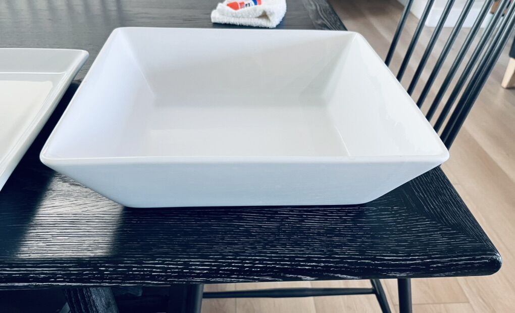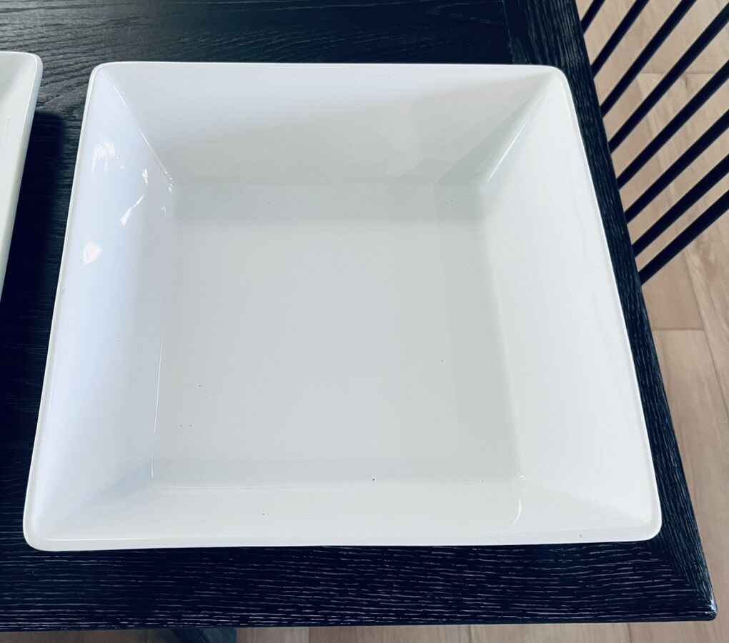 13 inch square by 3.5 inch serving tray. Excellent condition. No scratches, cracks etc. Used once. $35